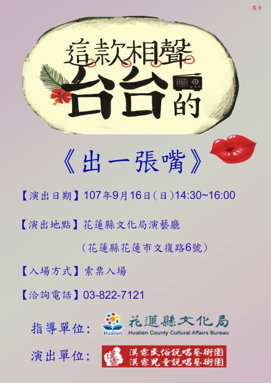 漢霖民俗說唱藝術團此次演出《出一張嘴》,選用貼合時事、更富有語言趣味的閩南語段子。希望藉由輕鬆有趣的說唱表演方式,讓國人珍惜臺灣本土文化的寶貴資產。除了可以看到老藝人爐火純青的表演與漢霖新生代演員搞笑功力,亦可於一戲多賞中,觀看傳統文化的多元生命力。準備讓花蓮的鄉親們笑到"母湯" "母湯"!詳情請洽花蓮縣政府文化局,或漢霖民俗說唱藝術團臉書粉絲專頁查詢。
