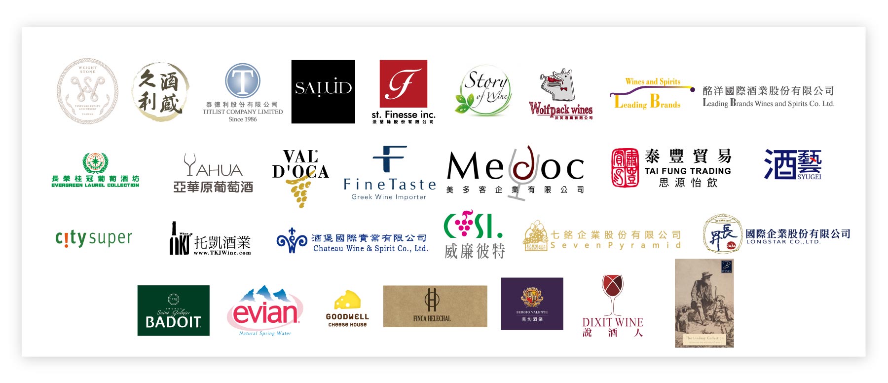 酒堡國際、長榮桂冠酒坊、法蘭絲股份有限公司、酩洋國際酒業、泰德利股份有限公司、七銘企業股份有限公司、泰豐貿易、美多客企業、托凱酒業、Salud、新希臘葡萄酒、亞華原葡萄酒、沃芙酒業、尚穎洋行、威石東酒莊、星坊酒業、威廉彼特、說酒人、意源國際