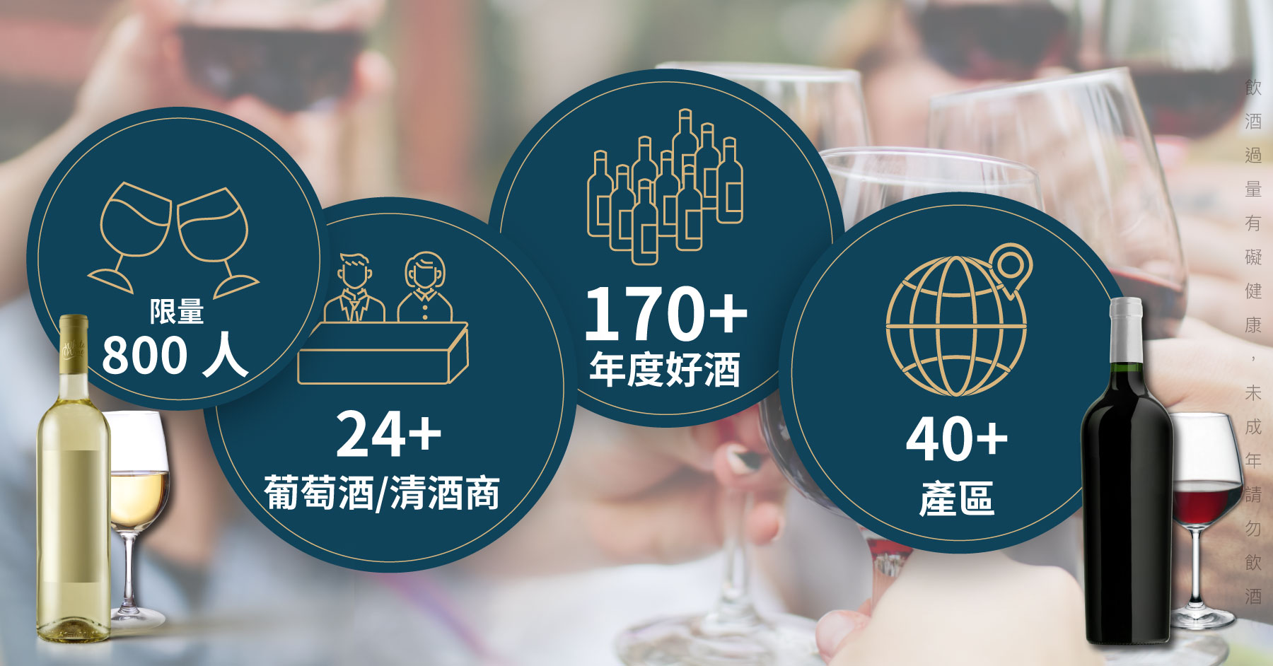 在這次長達 6.5 小時的酒展裡,集結 24 間以上國內資深葡萄酒、清酒進口商,嚴選 170 款以上年度最受歡迎的高人氣口碑好酒,讓你擁有充分的時間細細品嚐所有精彩酒款!