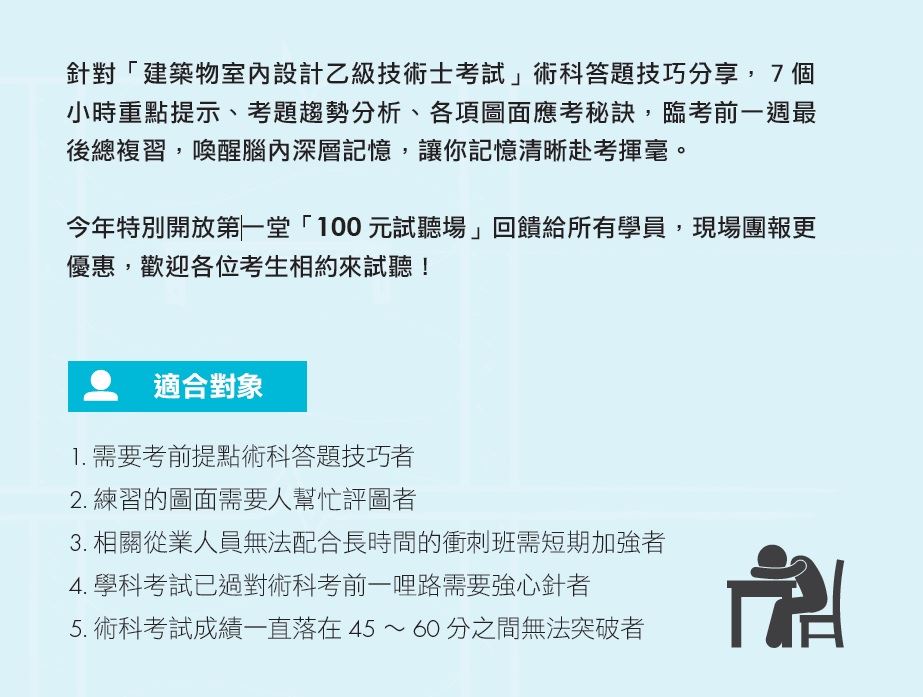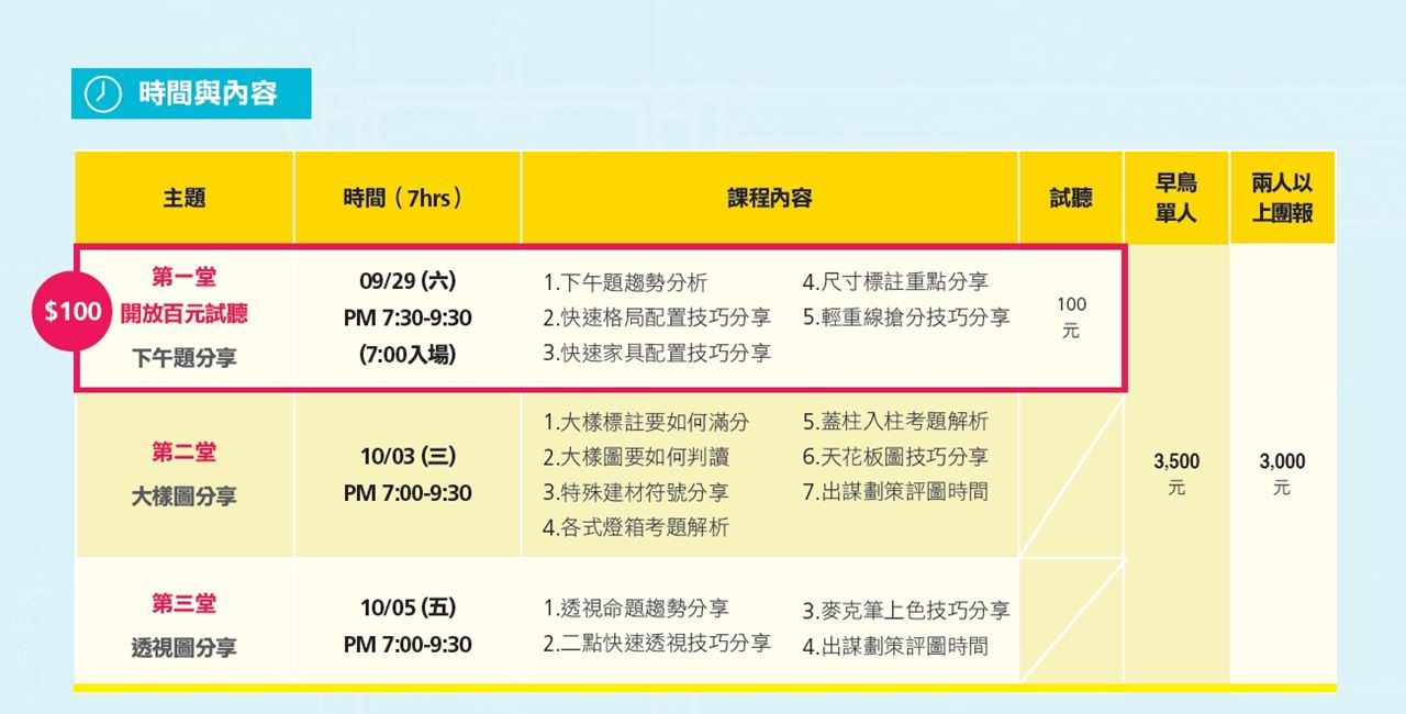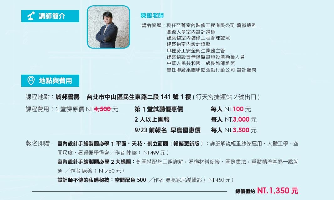 5. 《室內設計手繪製圖必學1 平面、天花、剖立面圖》與《室內設計手繪製圖必學2大樣圖》2本書為指定教材,並包含在課程費用中,若已事先購書者,請攜至現場,將補贈漂亮家居等值叢書。
