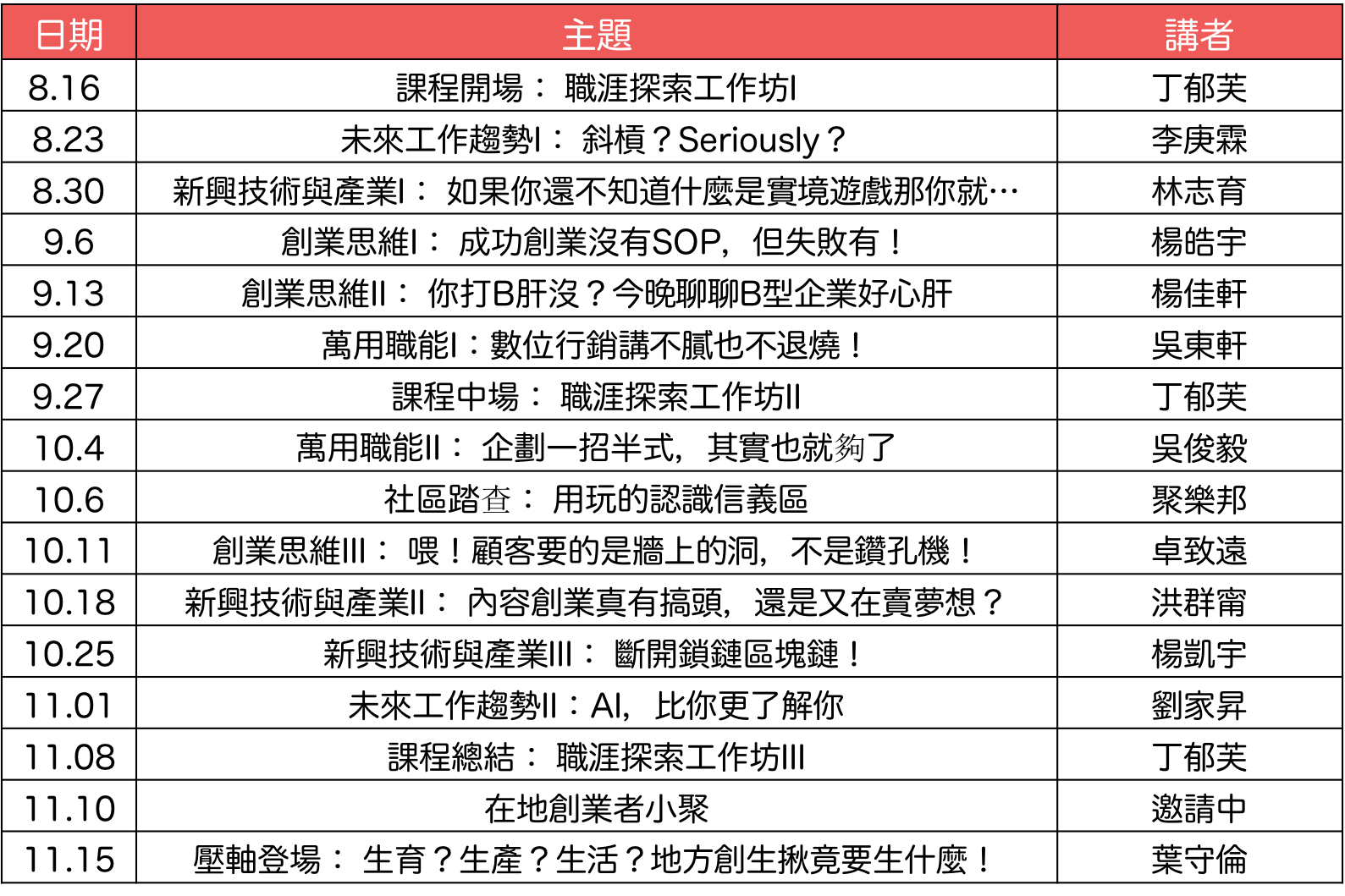 時間:08.16~11.15,每週四晚上19:30-21:30地點:台北市信義社區大學