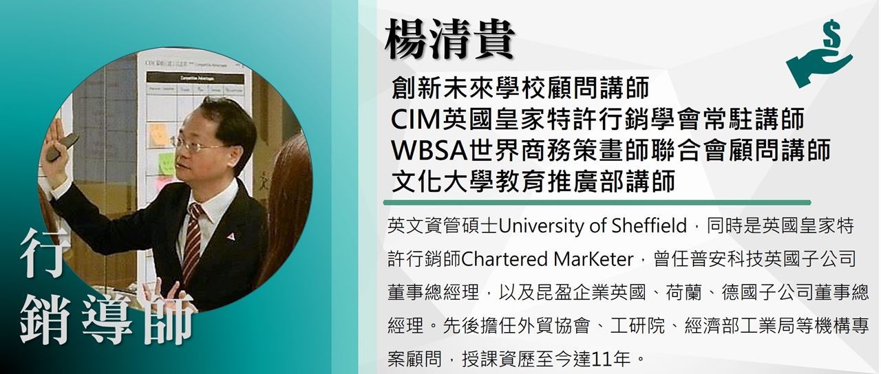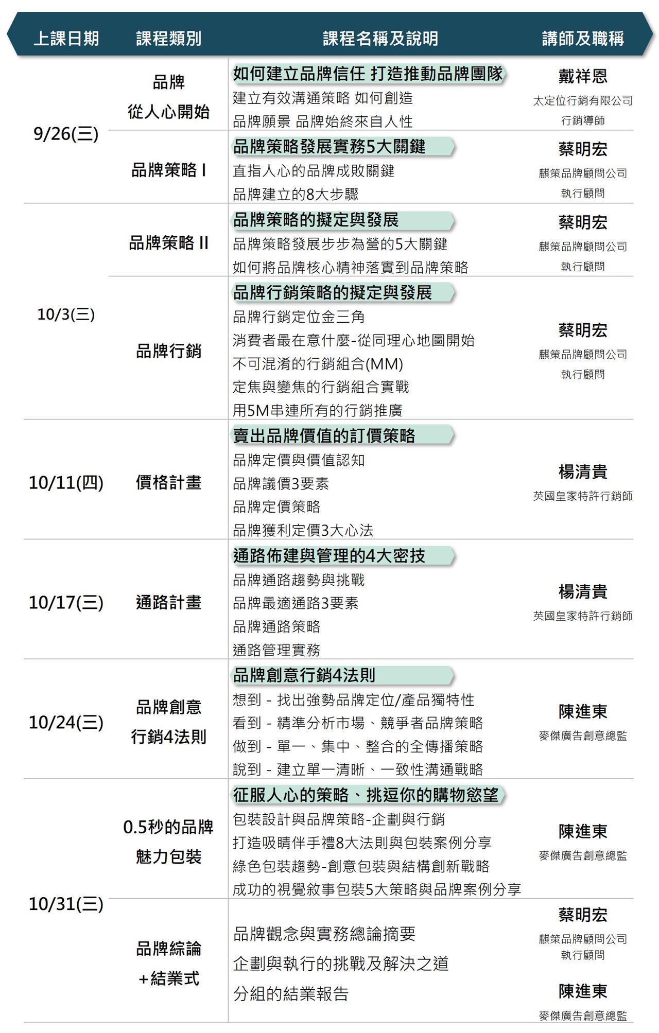 本次課程,將從品牌建立的源頭出發,有系統地帶領學員貫穿品牌策略、行銷溝通、定價策略、通路打造、與創意推廣、包裝設計;應用的教戰,則會以豐富的業界案例及實務經驗,再藉講師導引的獨特方式,讓學員體驗常輕忽的行銷戰略混淆、訂價陷阱、通路挑戰……等細節中的魔鬼。