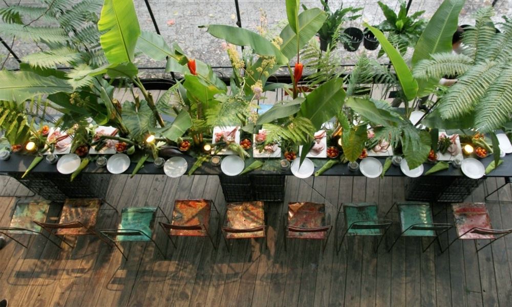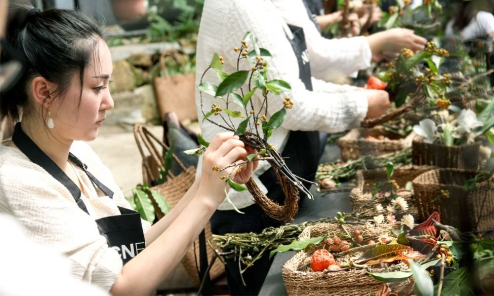 依據不同章節,場地可能發生在銀白色的溫室網狀長廊,亦有可能轉換至魔幻的瓜棚劇場。有別於在市區花市挑選花材,森大叢林裡,偶然的蟲鳴、沁心的微風,每一株花草都在展開笑顏,秘境中因季節更迭掉落的枯枝落葉,都是最天然的取材,透過教學與集體創作,完成專屬於這個章節的空間作品。