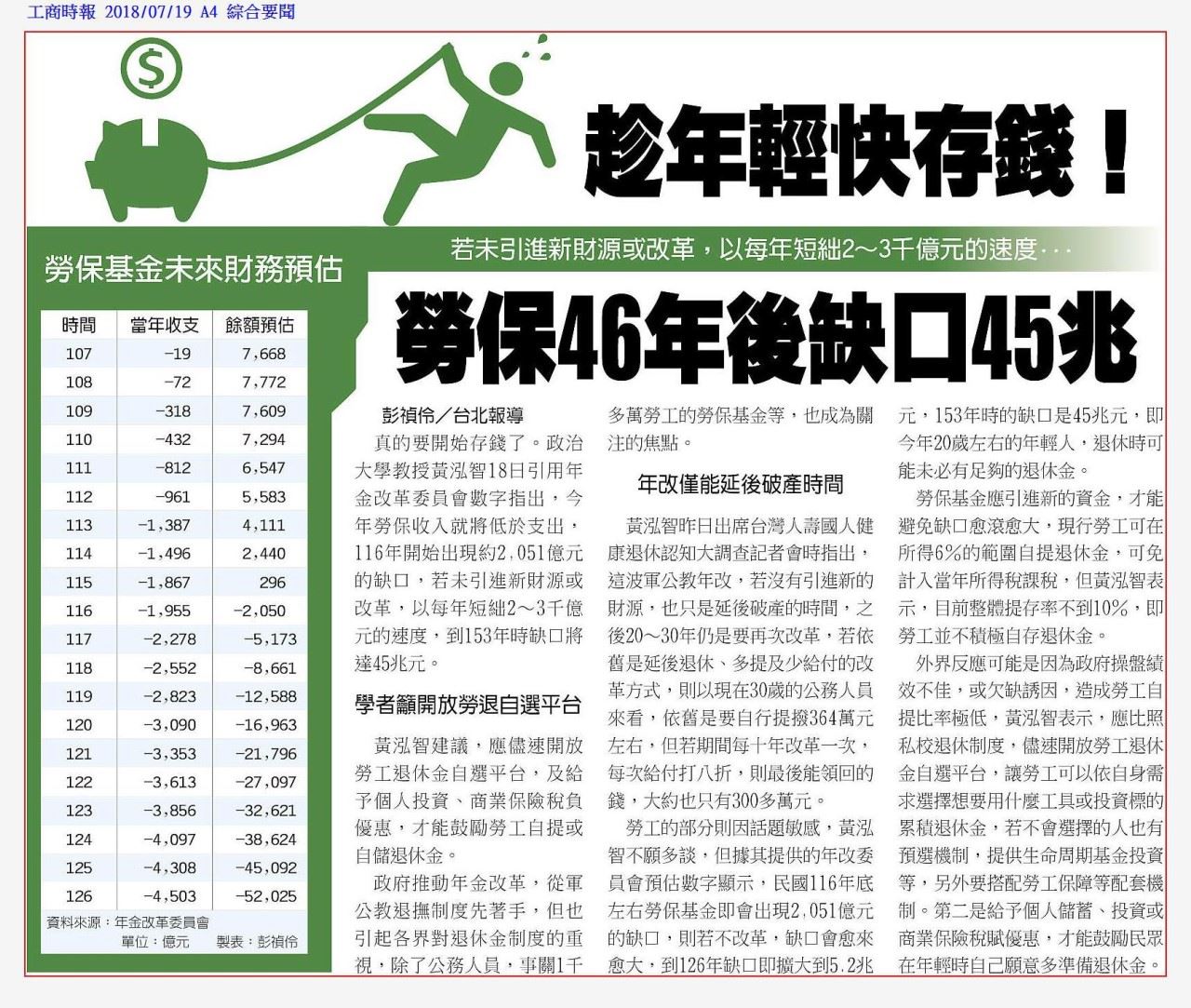 《工商時報》勞保預估8年後歸零,趁年輕快存錢!
