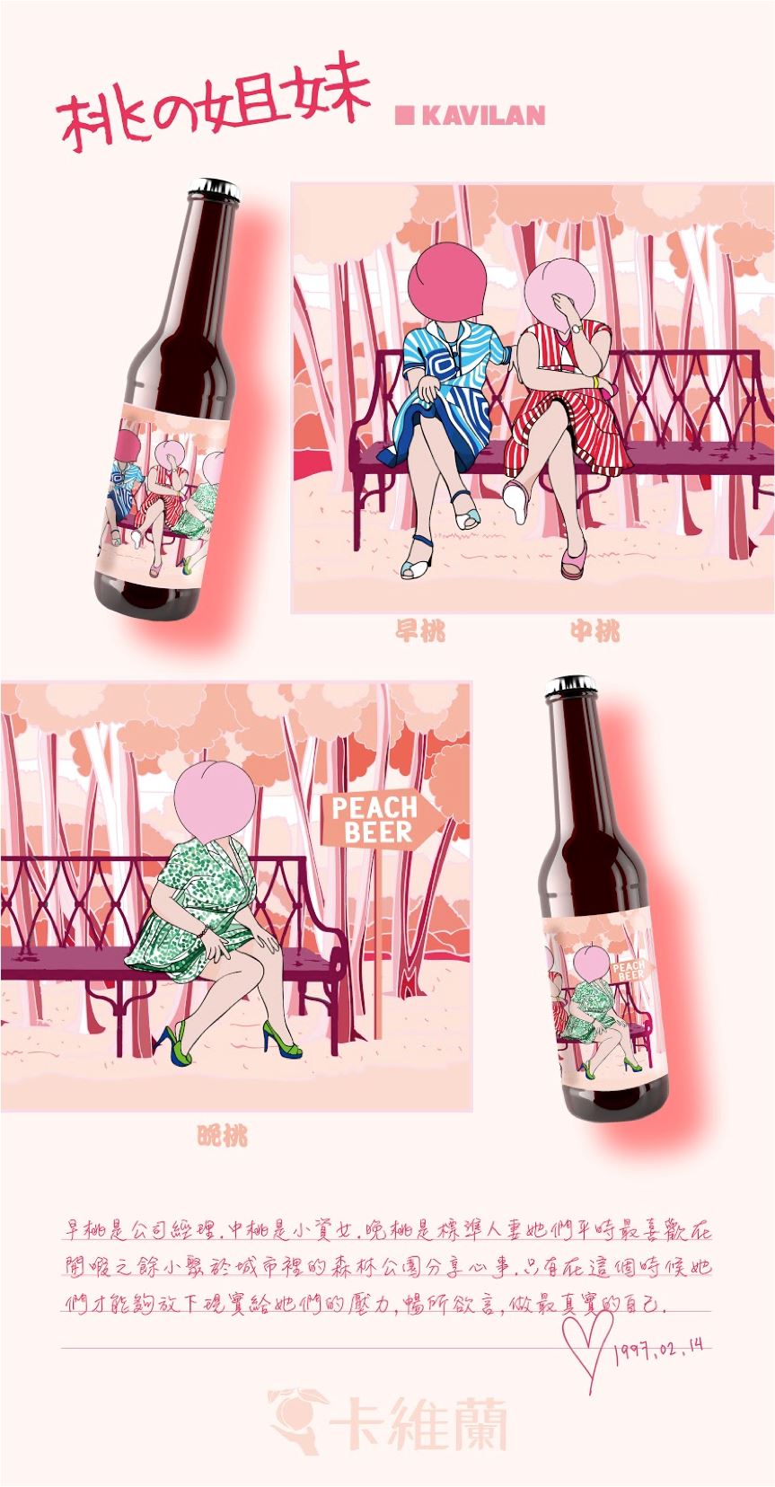 為何果農辛苦工作一整年,收入卻遠遠不如理想?2013年從大學畢業後,品牌主理人毅昕到拉拉山的小學服教育替代役,在役期將結束之際,毅昕在與果農的閒聊中得知了種植水蜜桃目前的困境——交通的不便加上盛產時的忙碌,讓果農們幾乎沒有心力在農忙之餘自行銷售,只得低價批給盤商,以一盒600元的水蜜桃為例,果農拿到的價錢約僅有180元左右。有些水蜜桃還能吃,卻因為外表不好看、太小、太歪斜而被淘汰,雖然有一部份會被拿來釀酒,但報廢的還是高達3成,真的非常可惜。「那時候覺得,種的人比賣的人賺得少,怎麼合理?」就抱持著一個這麼簡單的疑問,他找了幾個當兵同梯和大學同學創辦了「卡維蘭」,開始著手幫忙果農自產自銷、開發加工品。去年,我們找了釀酒廠代製了我們第一支精釀啤酒,以水蜜桃鮮果作為釀酒原料、加進滿滿鮮果,可惜成果不如預期;釀酒時,水蜜桃的香氣、甜味全都會在發酵過程中轉化消失,要在啤酒中喝到香氣爆發的「純天然」水蜜桃味,其實很難。很多喝慣香精啤酒的客人喝不懂純天然啤酒,所以我們常接到「為什麼沒有水蜜桃味」的客訴,讓我們相當哭笑不得,也只能低頭賠不是,再慢慢跟客人解釋。乘著去年的經驗與消費者回饋,今年卡維蘭再接再厲,在依然堅持純天然的前提下改變了釀造流程,終於釀出了能同時兼具天然與「水蜜桃味」的啤酒!走到這裡,目前卡維蘭的水蜜桃啤酒似乎成功解決了一些土地問題、食物過剩的議題,但這並不會是我們的終點,我們依然還在這塊土地上找尋著值得或應該被看見的好酒好物,希望透過我們的力量,讓台灣的環境變得更好一點點。