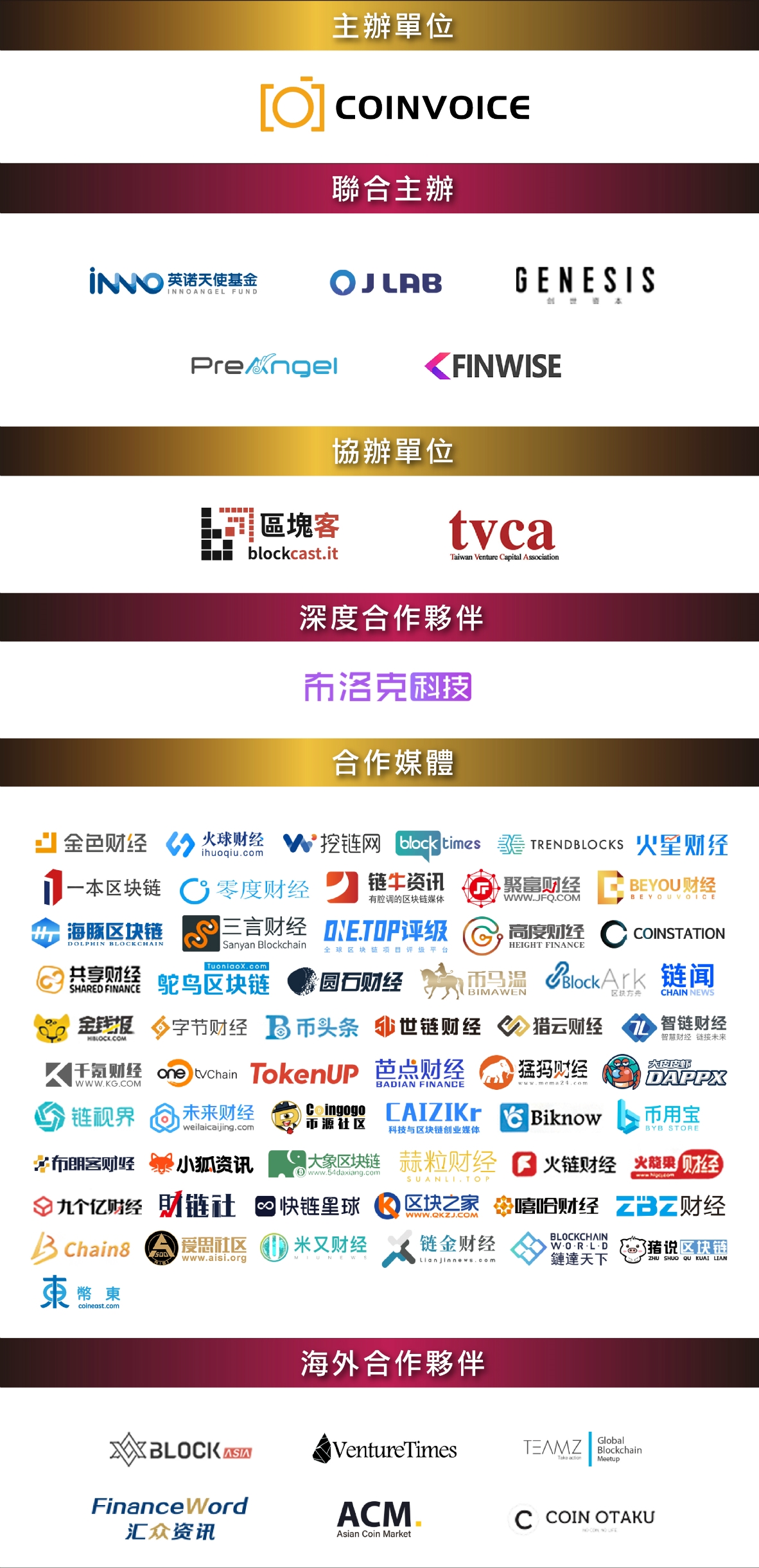 本次『CoinVoice 2018 Blockchain Innovation Summit』區塊鏈峰會由英諾天使基金、J Lab、PreAngel、創世資本、FINWEX聯合主辦,區塊客協辦
