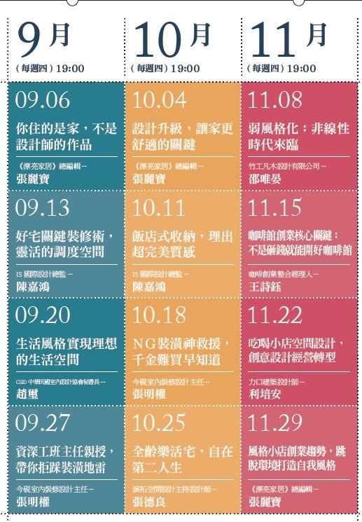 費用:全程12堂課4,000元(定價4,800元、單堂400元);每場可獲贈《漂亮家居》過刊雜誌