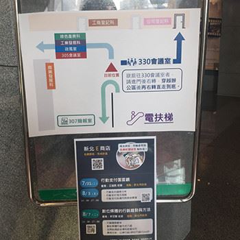 - 路線指南:新北市政府大廳搭乘電扶梯至三樓,可看見330會議室路線指示牌與活動海報,需穿越市府辦公室即可看到330教室。