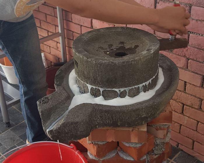 用傳統石臼將黃豆研磨成豆漿,親手將岩磨成功的濃郁豆漿過濾後