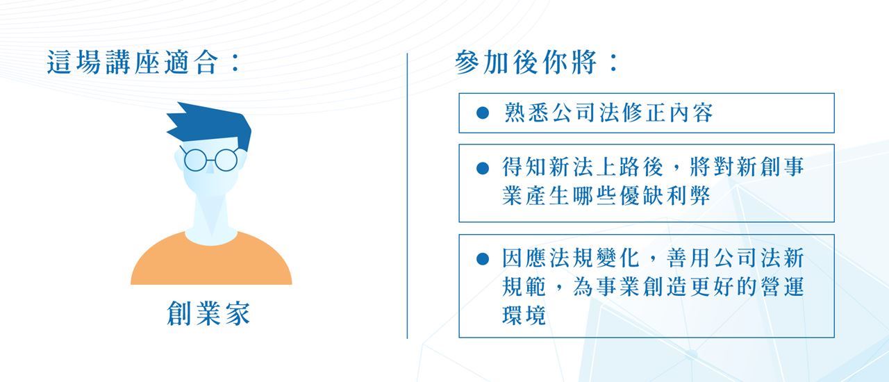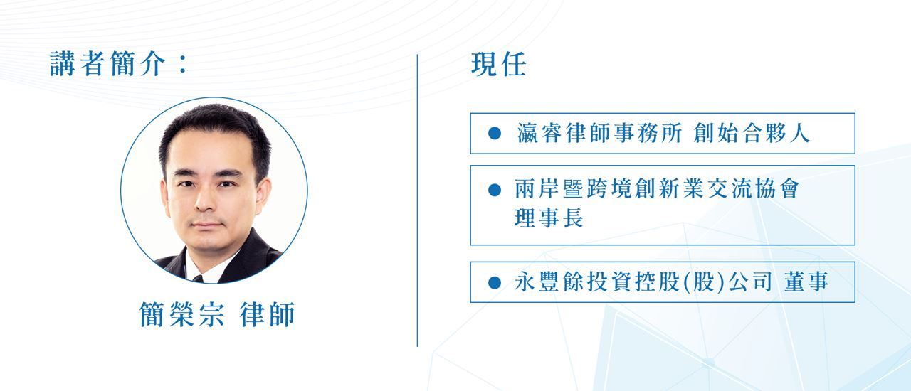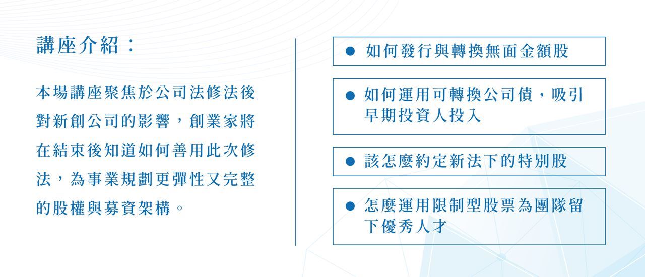 本場講座將邀請「瀛睿律師事務所 簡榮宗律師」說明此次公司法修法重點,例如非公發公司不再三董一監、放寬盈餘分派次數與員工獎酬等重要法規變革,及其對新創產業的影響。
