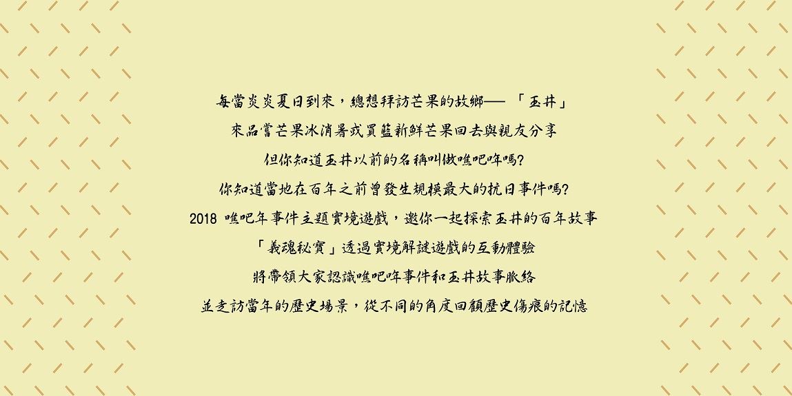 < 相關連結 >噍吧哖事件紀念園區 粉絲頁:https://www.facebook.com/tainantapanipark/芒果遊戲 粉絲頁:https://www.facebook.com/MGS.fan