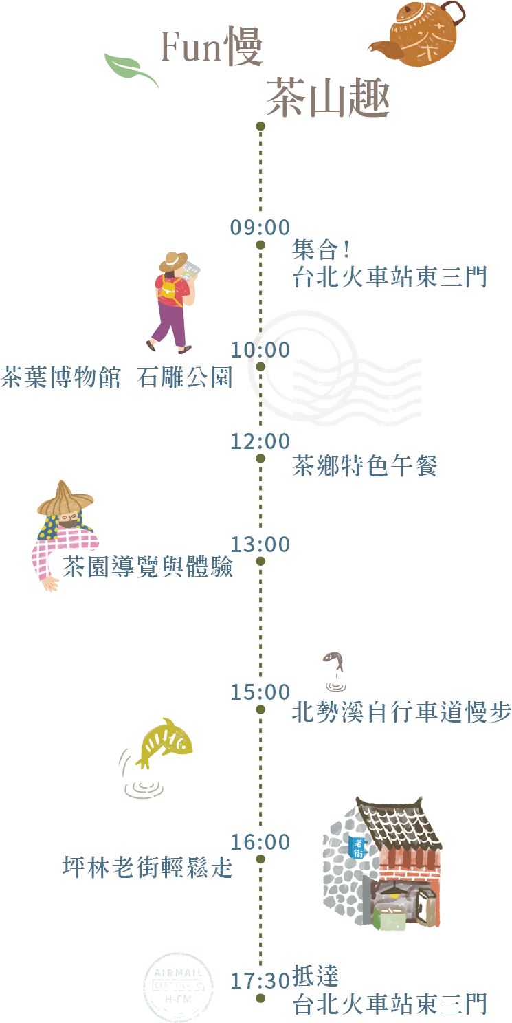 - 舒適專車+導覽(茶業博物館+石雕公園)+茶園體驗導覽+北勢溪步道慢走+保險