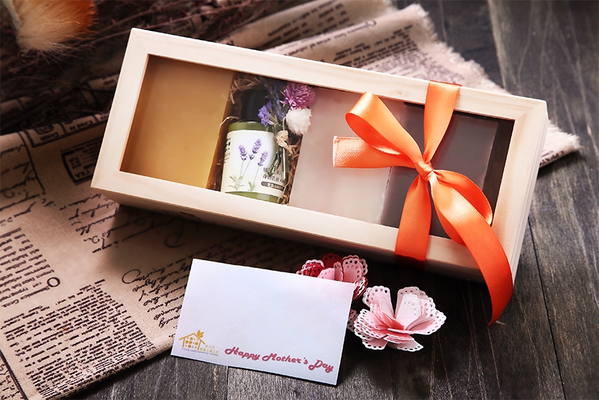 內容物:100克精油皂三顆(香味隨機)、45毫升植萃薰衣草身體乳液乙瓶、乾燥花、精緻玻璃蓋木盒、精美提袋