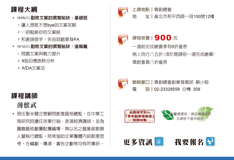 ☑ 單一課程超過1,000元以上,即贈送100元課程折價卷,可折抵下次青創學院課程費用