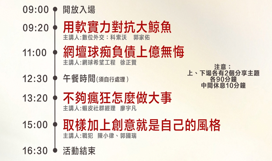 2. 本活動報名參加後即知悉主辦單位將於活動過程中錄影錄音且同意簽署肖像權使用同意書、個資保護與隱私權文件。