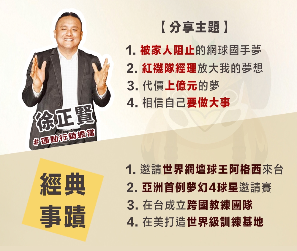 一次波士頓紅襪隊參訪,讓他放棄竹科新貴的工作,在短短幾年的創業時間,徐正賢在台灣舉辦了兩場撼動人心的超級賽事 — 邀請世界網壇球王阿格西來台。在他眼中唯有不斷顛覆台灣人對運動的想像,一直做大事,這樣才有機會帶給台灣的運動生態一個嶄新的未來。