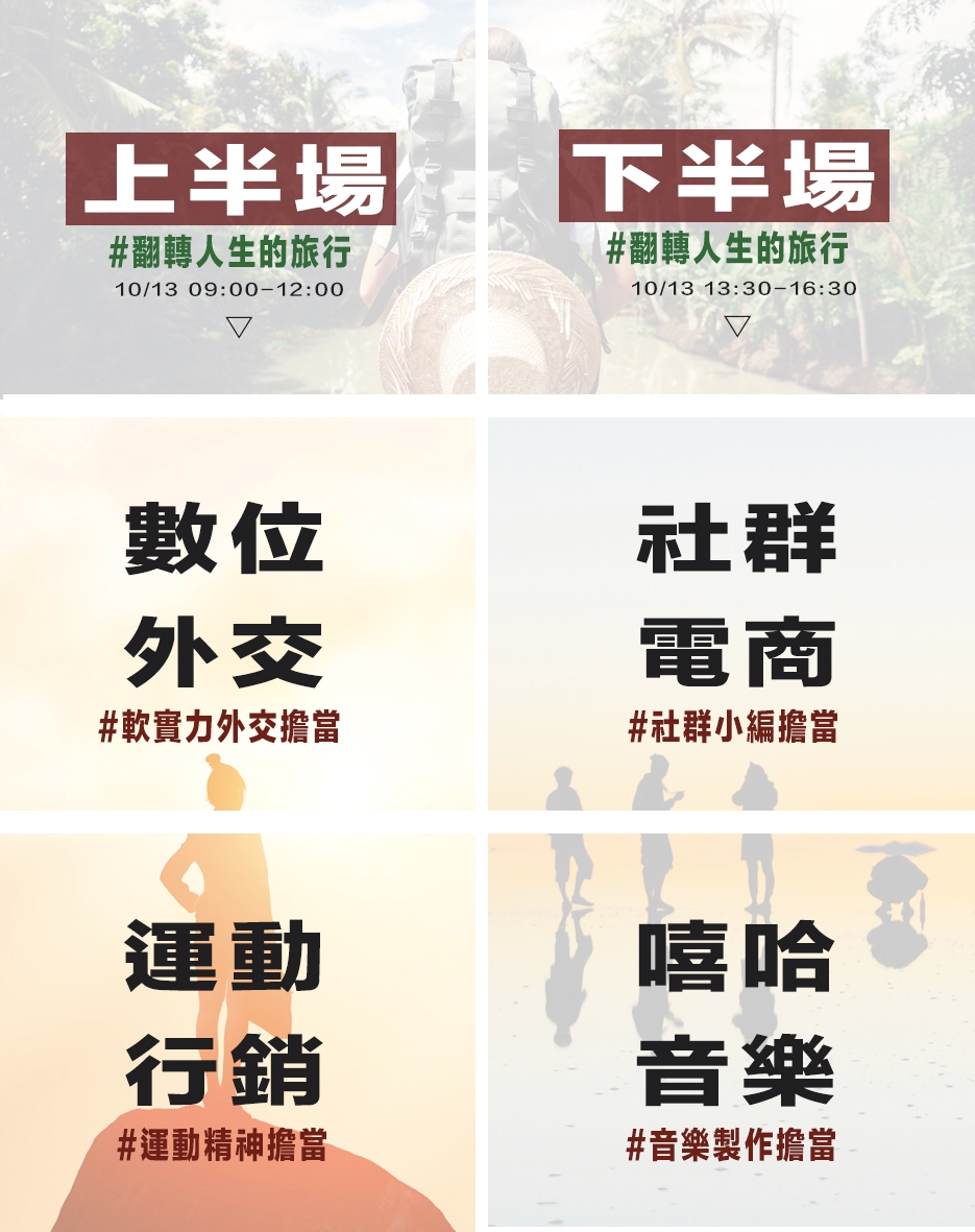這次的活動分成上下半場,總計橫跨四個領域。他們的工作大多突破社會傳統,所以幾乎都是從0開始,到底是怎麼樣的旅行力量,讓他們願意大刀闊斧的斬斷過去對職涯認定的枷鎖,而勇敢創造自己的人生呢?