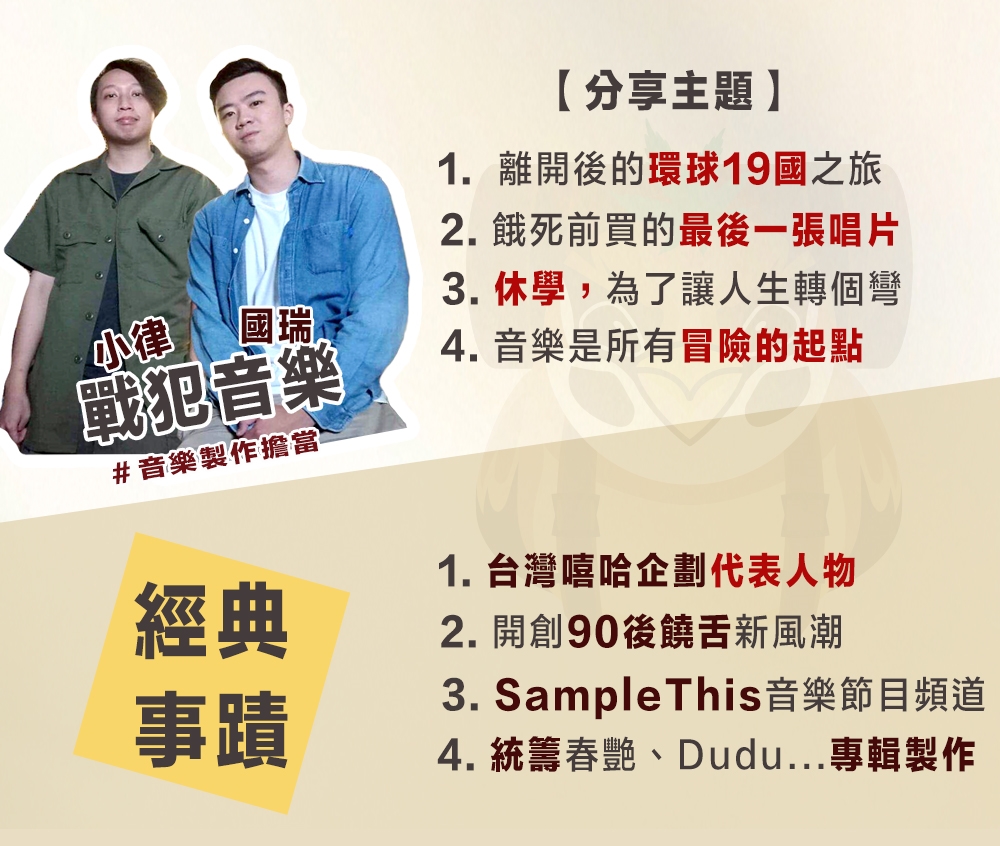 戰犯的創辨人小律就像魯夫一樣,一路搜集不同強項的夥伴,突破以往製作人只能在幕後操作的方式,把自己拉到台前,2017國瑞加入戰犯更補齊了團隊中內容企劃的角色,第一次聯手出擊就在Youtube推出獨創的音樂頻道《 Sample This取樣這個》,看音樂製作人如何用取樣翻玩經典,也因為內容探討取樣跟抄襲的差異,在網路上掀起一波討論熱議。相同的旋律,做出不一樣的音樂,戰犯要用創意玩出自己的音樂廠牌-戰犯。