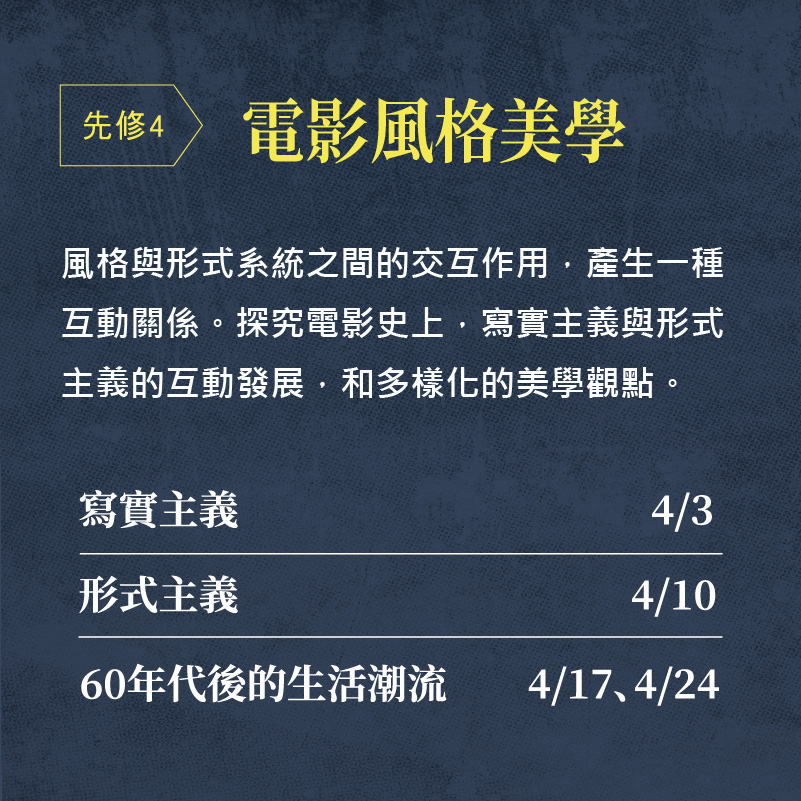 這個課不教大家拍電影,而是從電影的某一些元素,追溯其根源;以及它後來逐步演變成為不同的美學風格為核心;屬於電影美學跟風格的探討。- 黃建業