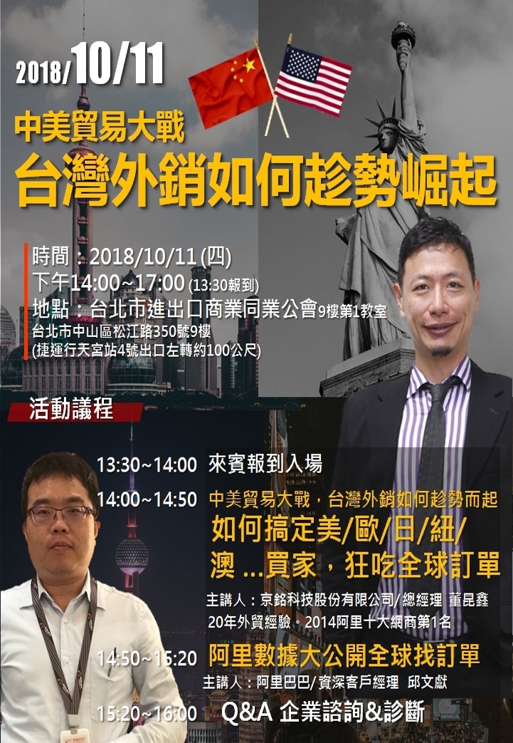 中美貿易戰,對台灣是個趁機崛起的大轉機!總經理將獨家傳授活用阿里大數據,獲悉國際市場趨勢,切入國際供應鏈,打開海外商機大門。招商會中將無私分享電商平台營運Khow-how、外貿接單實戰經驗,如何透過平台搞定美、日、澳、非洲等國,狂吃全球訂單。