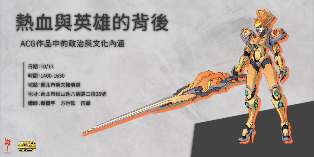 各方專業講者!美漫、ACG研究到臺灣原創!本次請到ACG研究與行銷的識御者創辦人黃璽宇;Geek Base 創辦人,歐美娛樂達人POPO方世欽;海穹文化的大魔王,催稿界的生物學家(誤)伍薰!來與大家一同分析ACG!