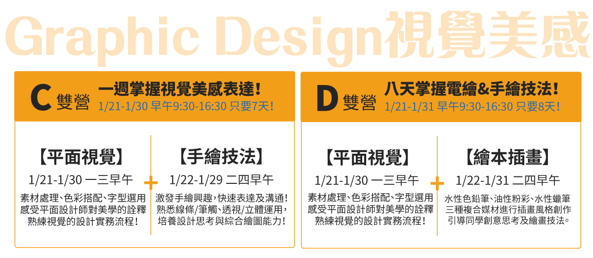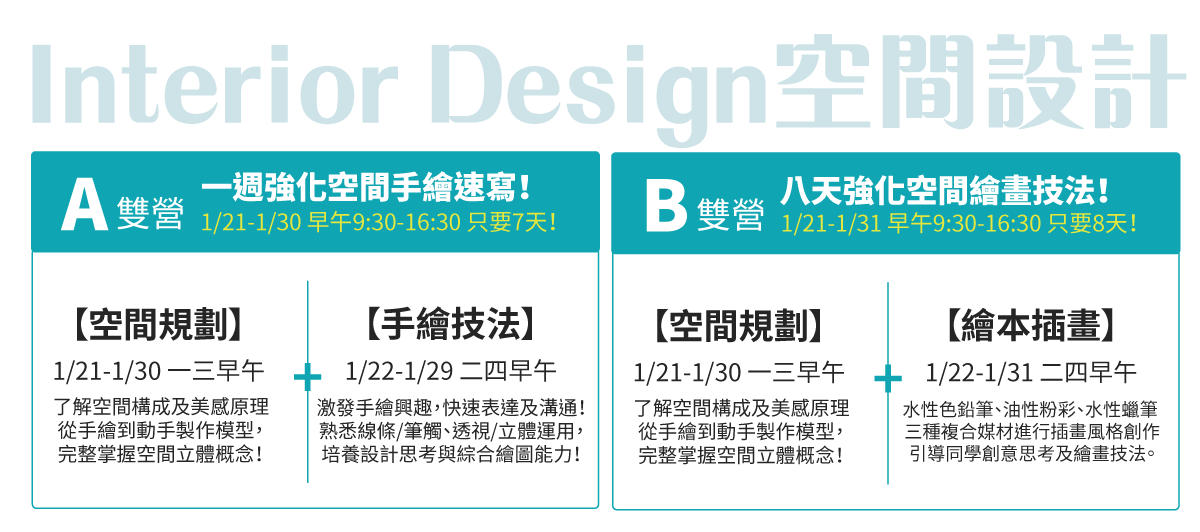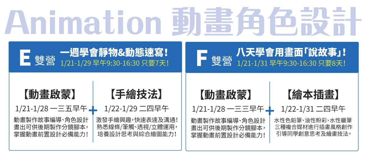 <動畫啟蒙營><平面視覺營><繪本插畫營><空間規劃營><手繪技法營>