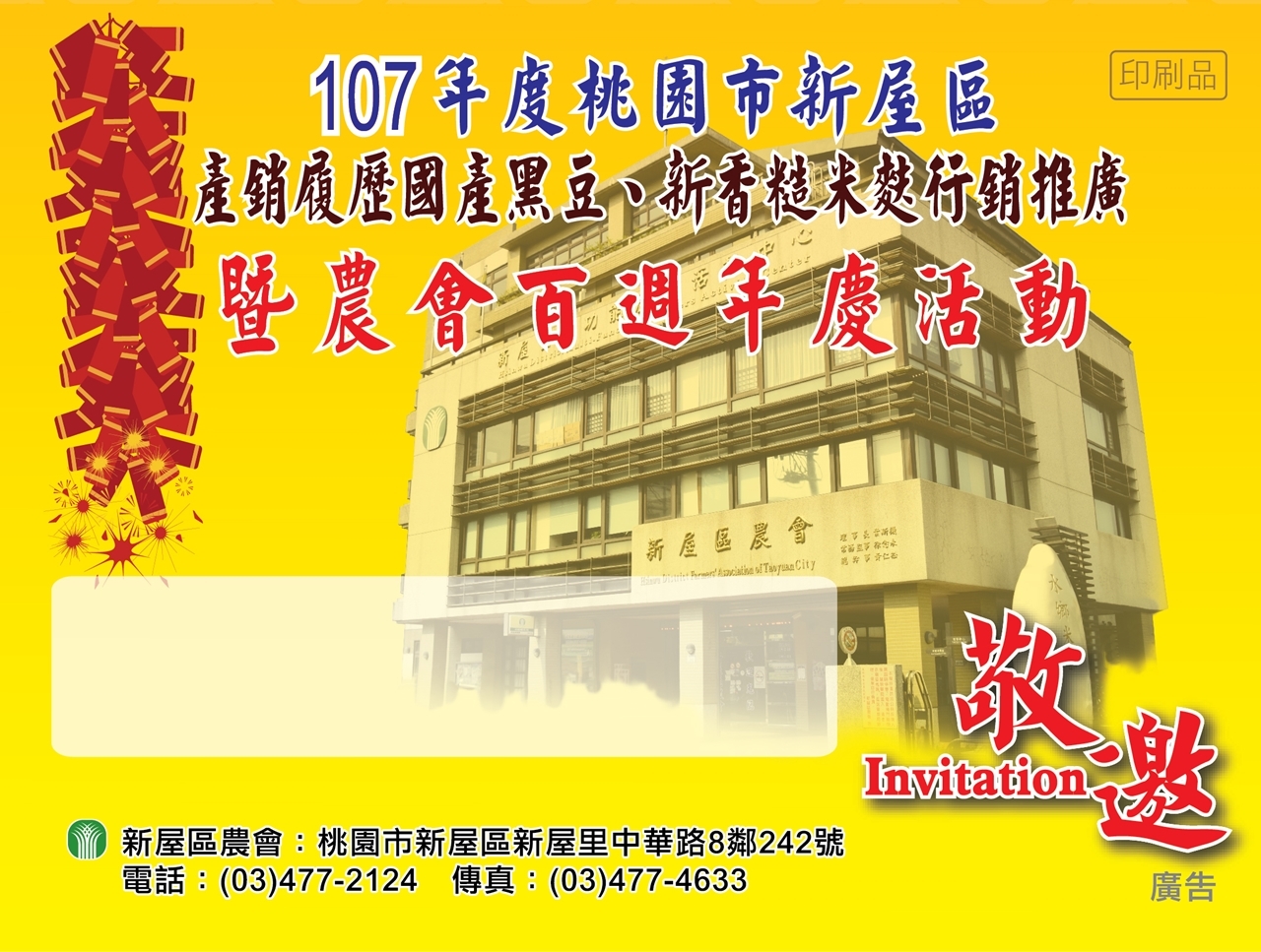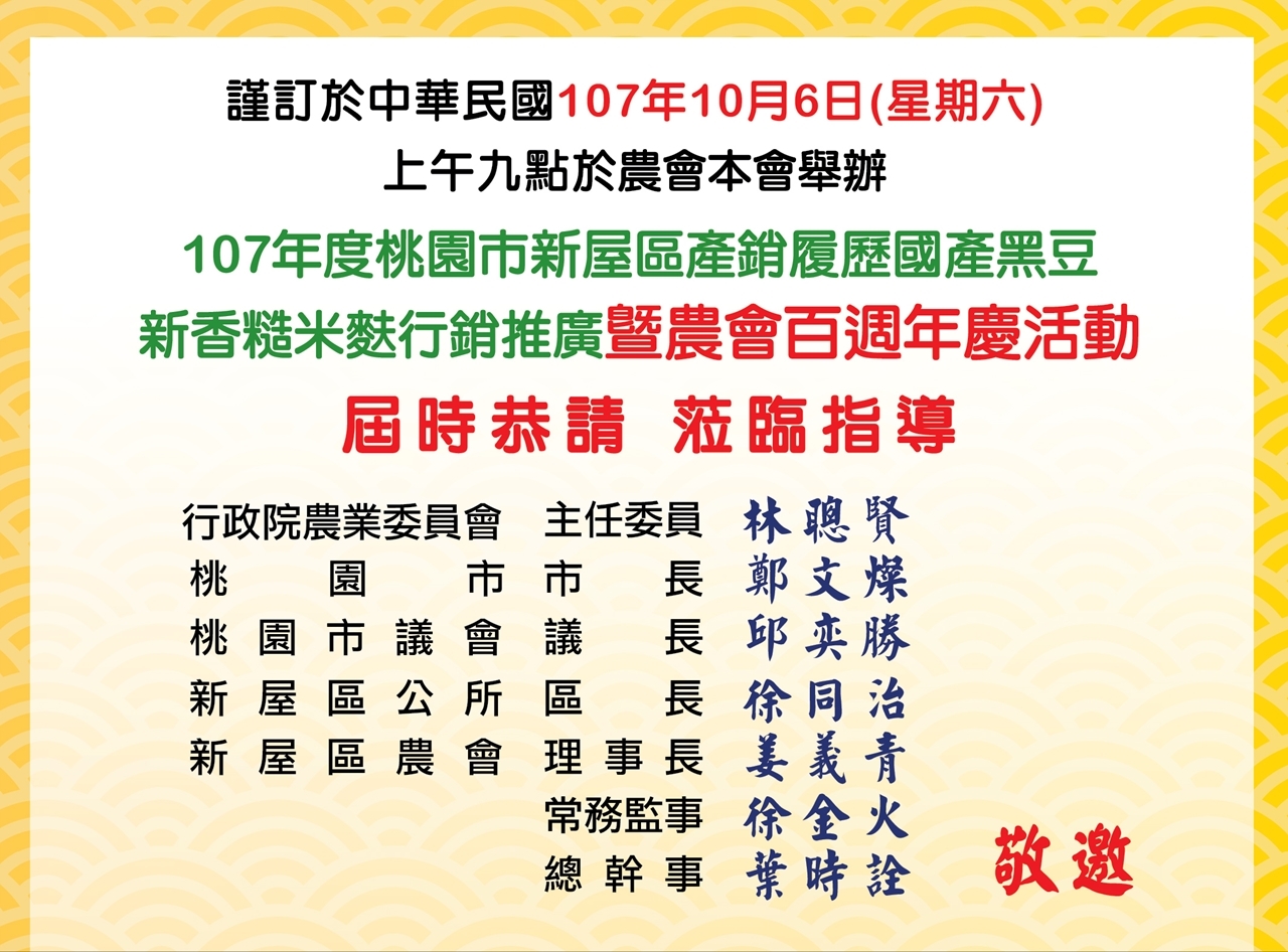 新屋區農會將目前達到的農業產銷成果展現在這次百周年慶活動,並邀請農委會主委林聰賢與桃園市長鄭文燦、桃園市議會議長邱奕勝與新屋區區長徐同治蒞臨指導!新屋區農會理事長常務監事總幹事,一同邀請民眾來新屋區農會更了解桃園新屋優質農產品!
