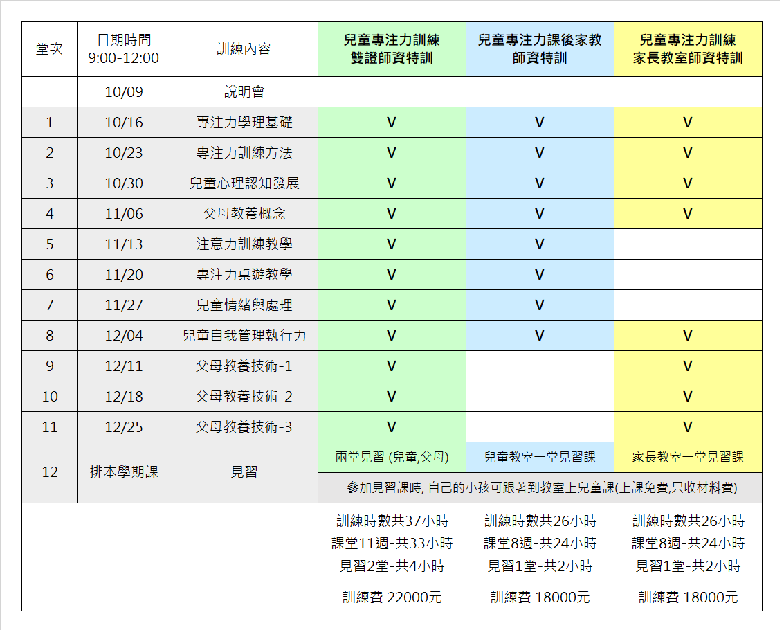 **已參加過兒童專注力師訓的老師享學費七折特惠,家長教室師資特訓費用每人12600元。