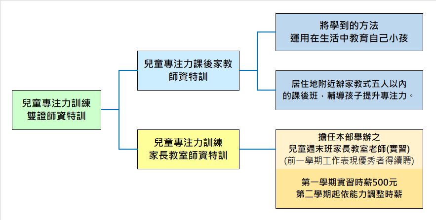 1. 參加師資班完成全程訓練課程+至少一堂見習課,受訓學員完成以上兩段流程後,由社團法人專注力訓練推廣協會頒發結業證書。