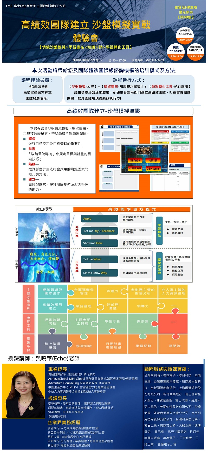 1.每家企業提供一位體驗名額(超過一位請來電洽詢)2.主辦單位保留活動異動、內容調整與接受報名的權利!※課前將E-Mail上課通知單;若未收到,煩請來電 ※課程諮詢-林小姐/彭小姐 : (03)334-2469