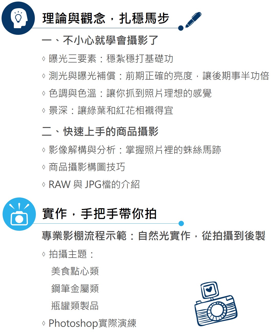 ※ 本次課程實作部分包含前期商品拍攝與後期PS操作,LR因時間關係僅以現場示範為主。