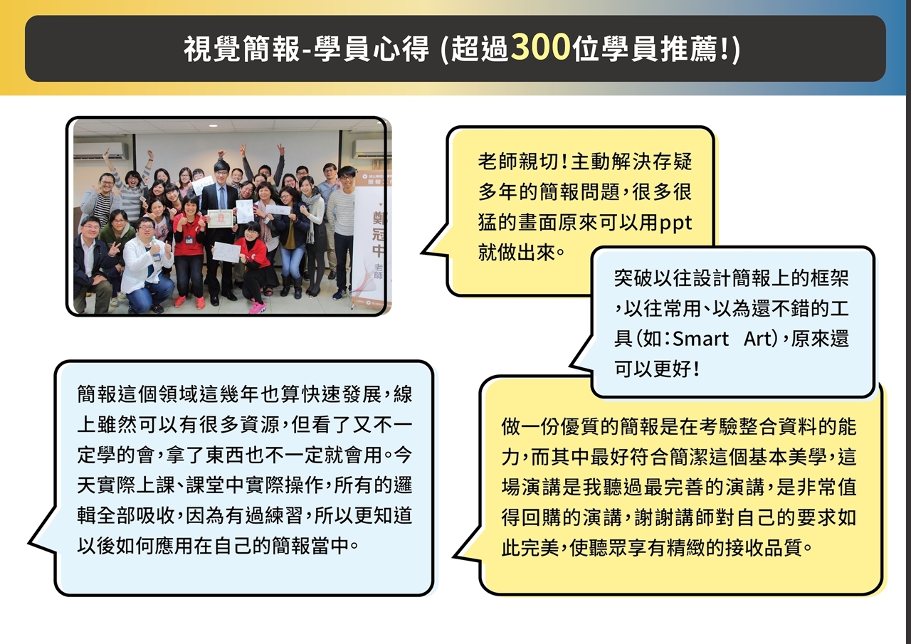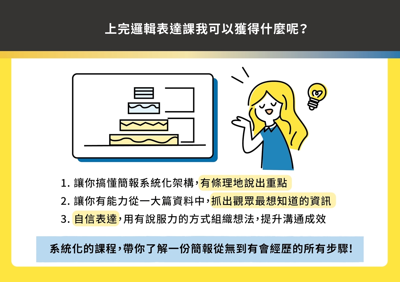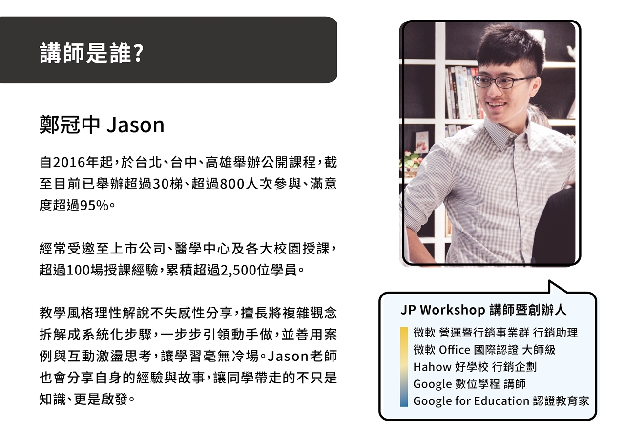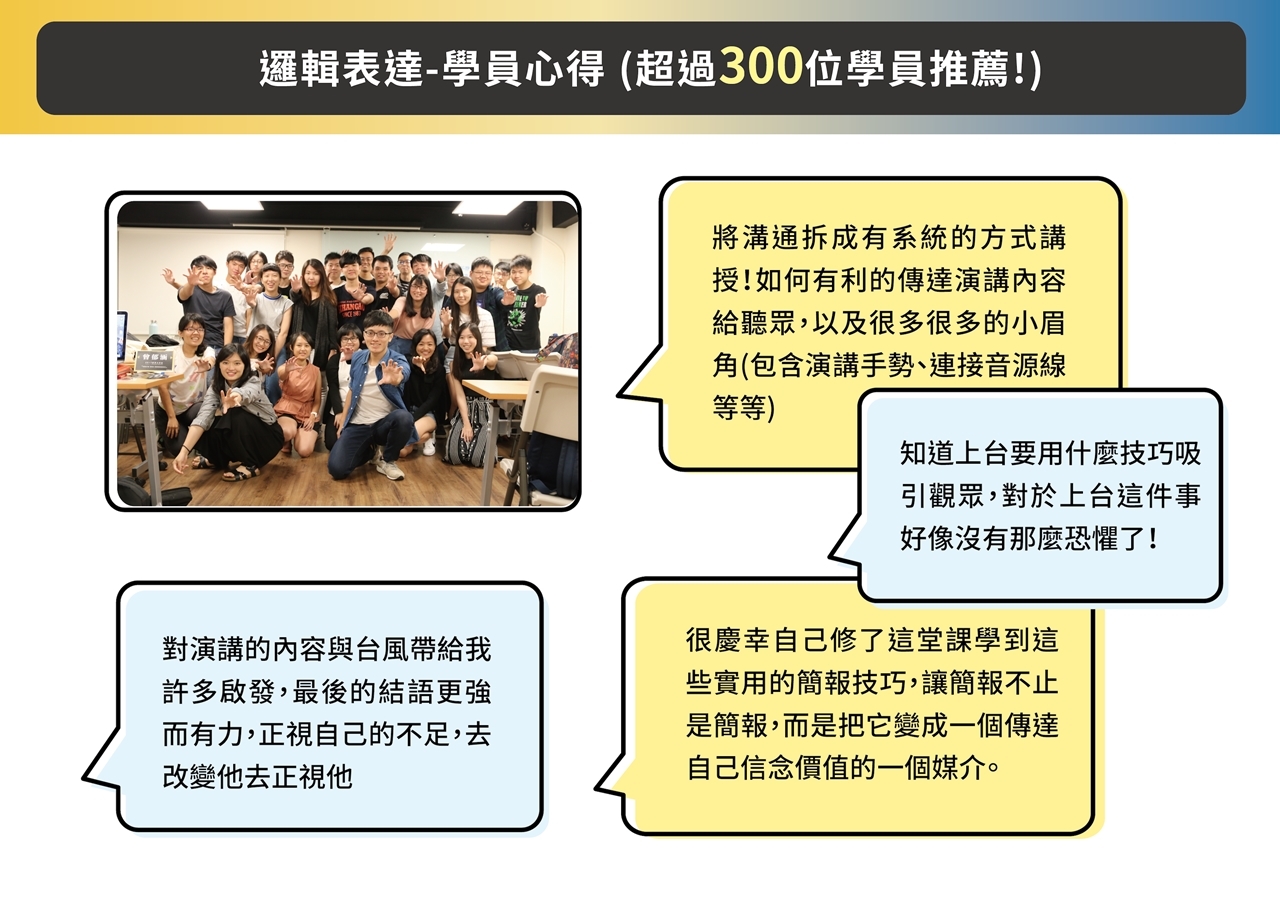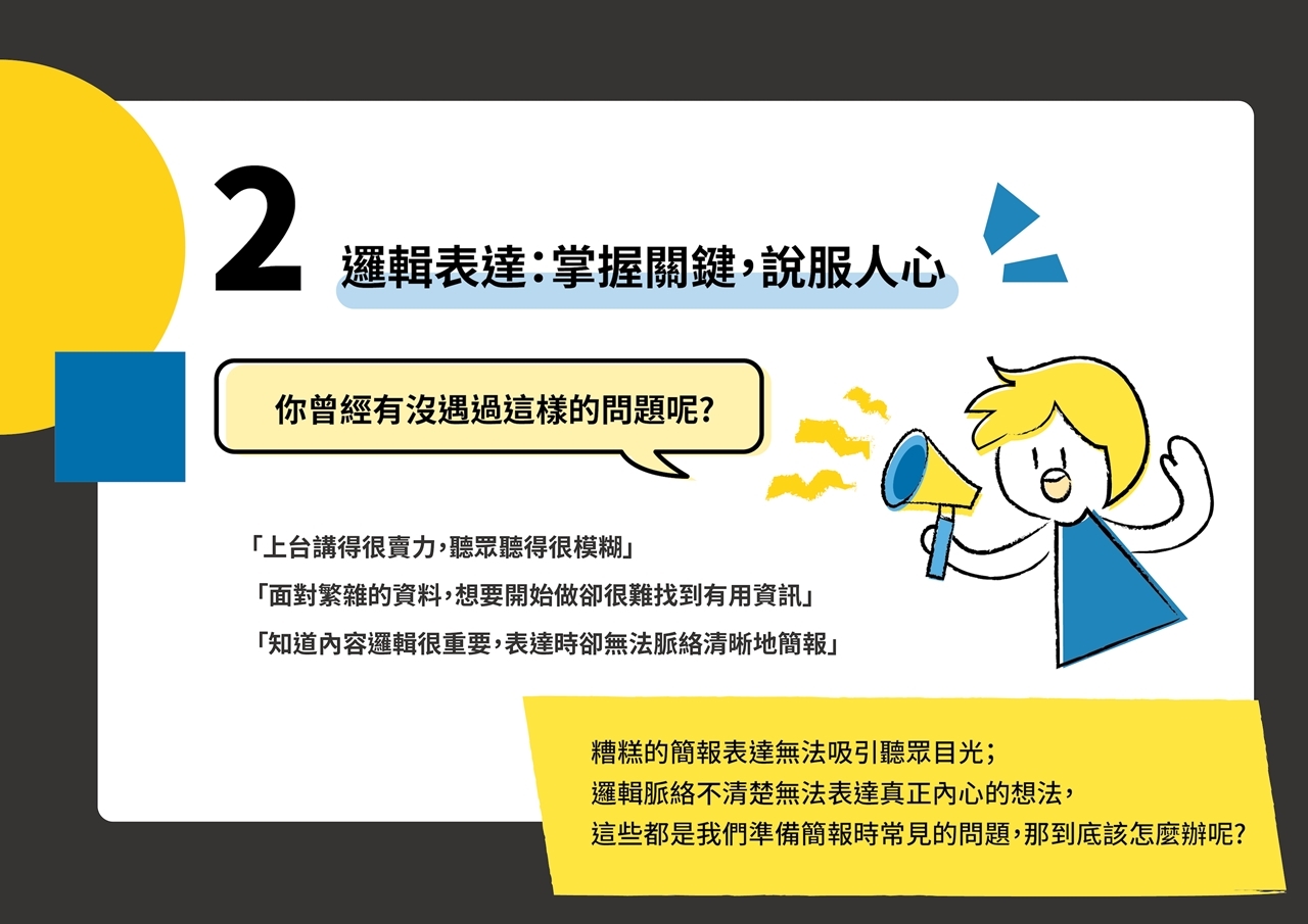 超過百場演講、教導數千位學員的經驗,把你可能會發生的問題,進行詳盡的講解。 無論你是職場人士、大學生,我們將用系統化方法,一同建構 #簡報的完整觀念。