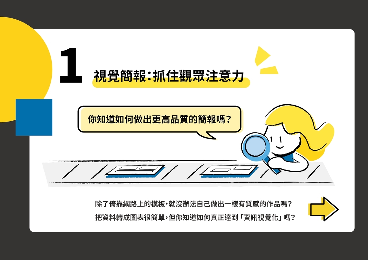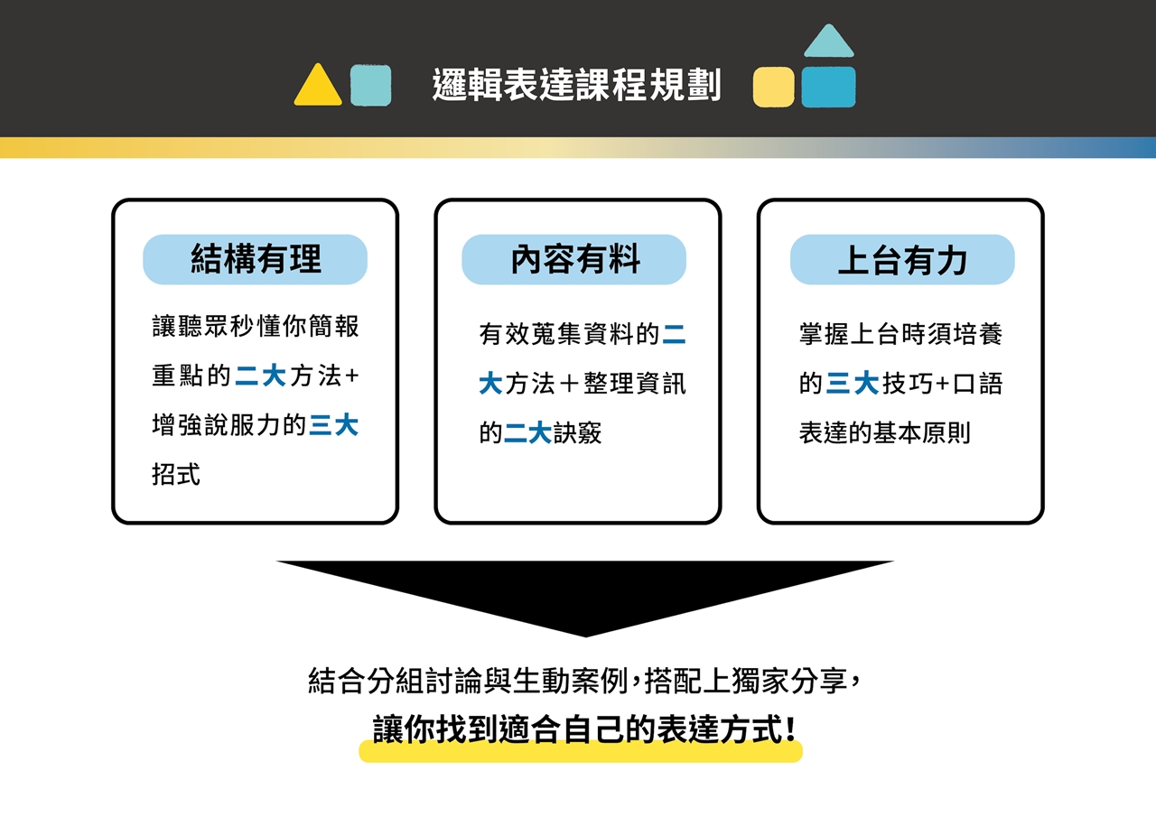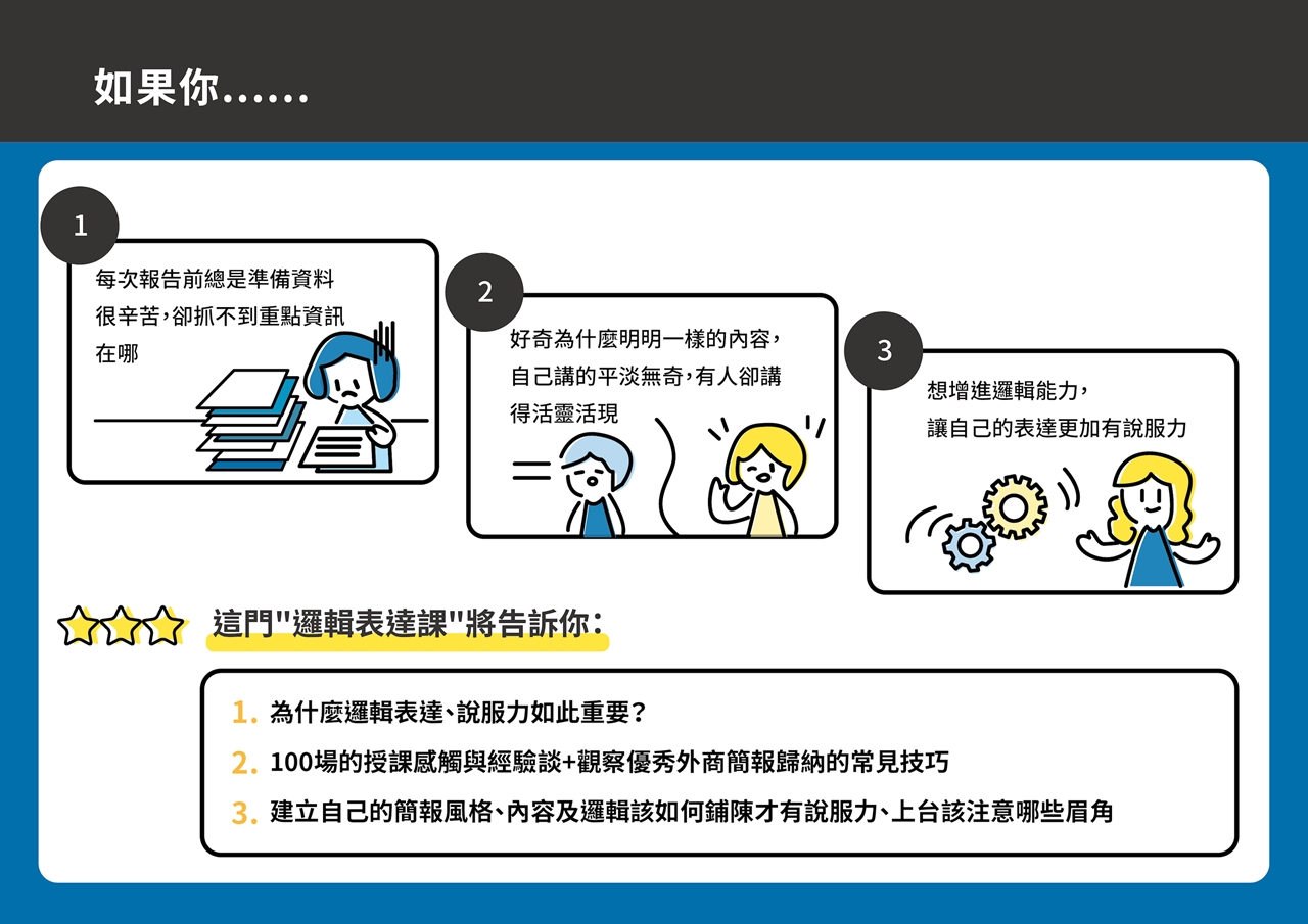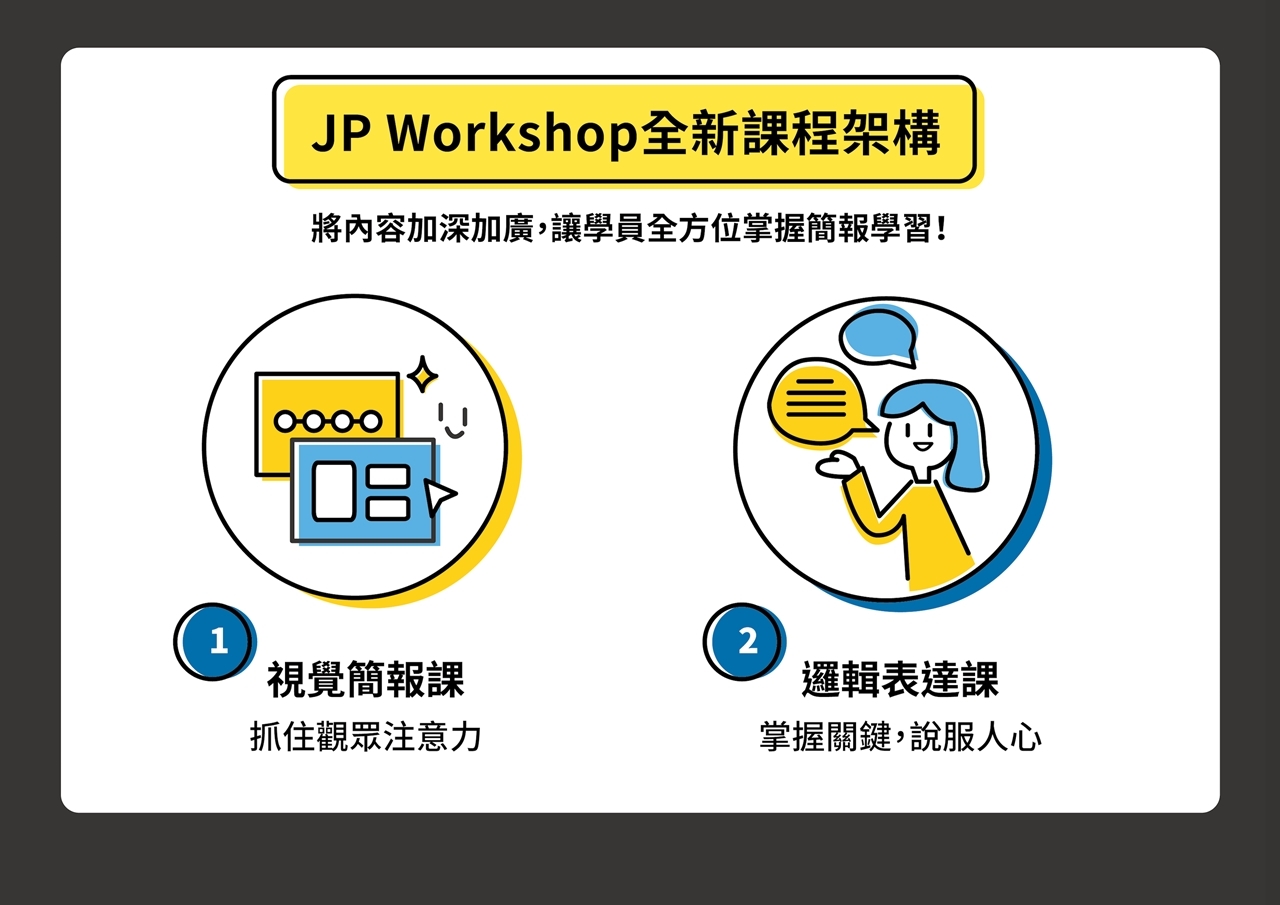 這門升級的課程,把上台必備的簡報力分為 #簡報視覺課 與 #邏輯表達課, 每堂課3.5小時,7小時帶你全盤掌握視覺與表達兩大面向的訣竅。