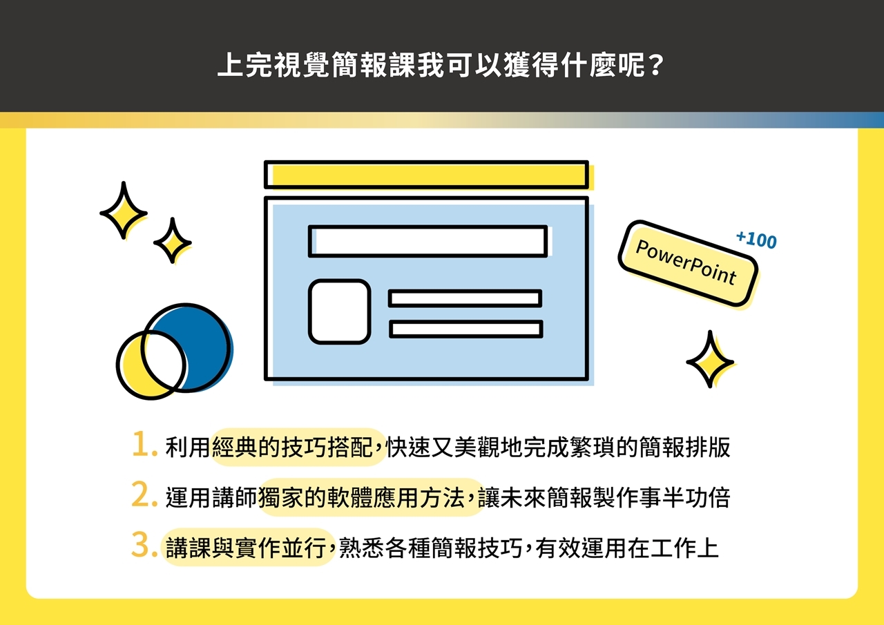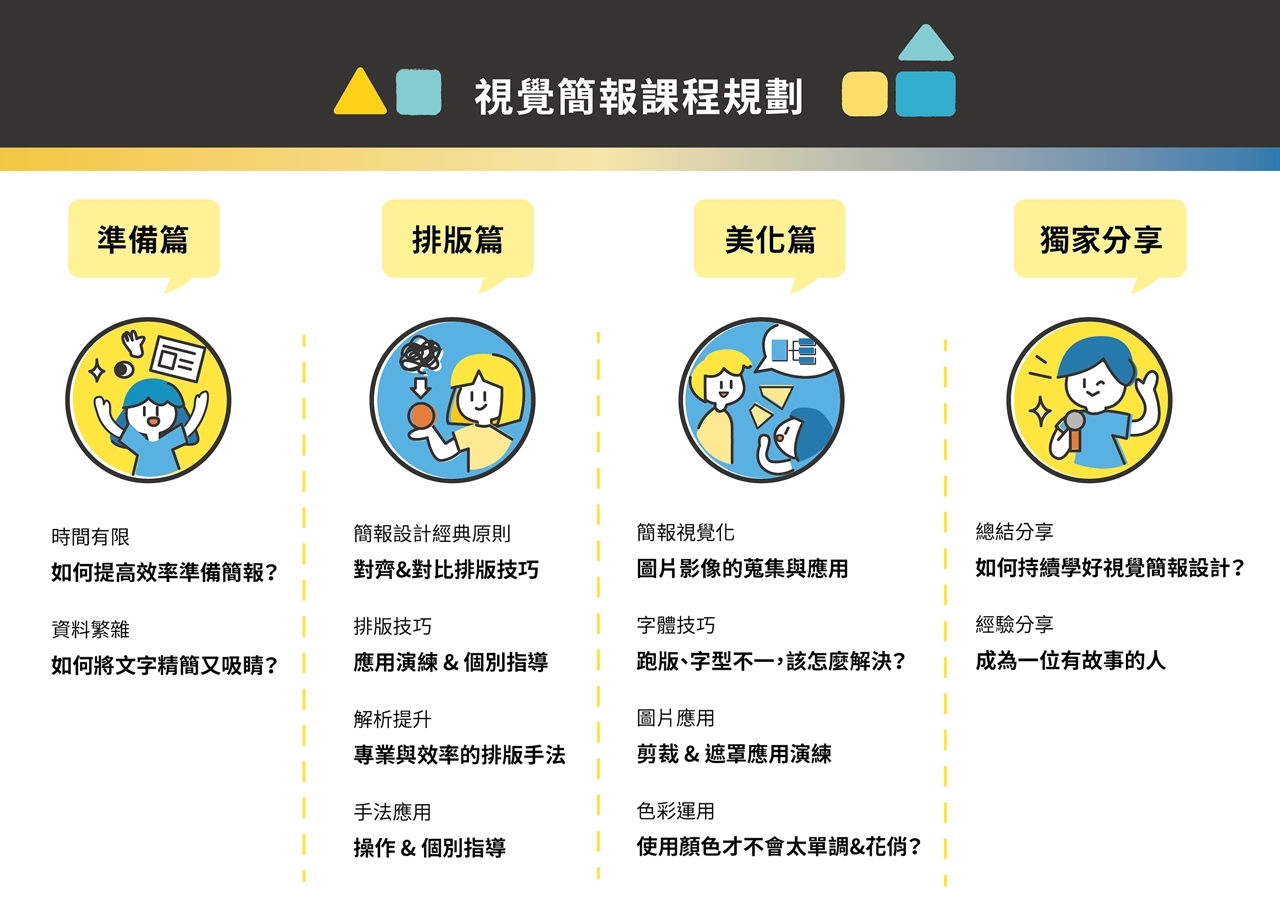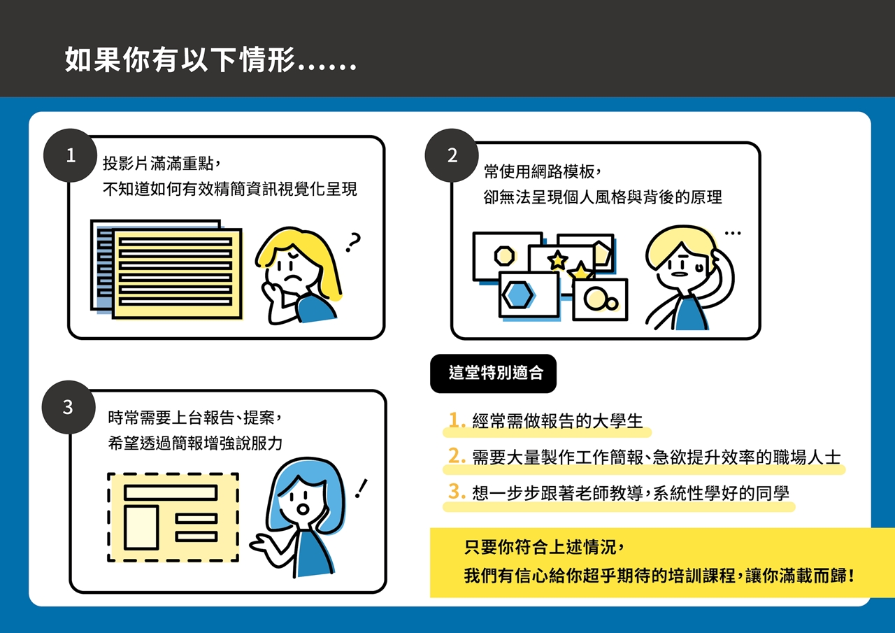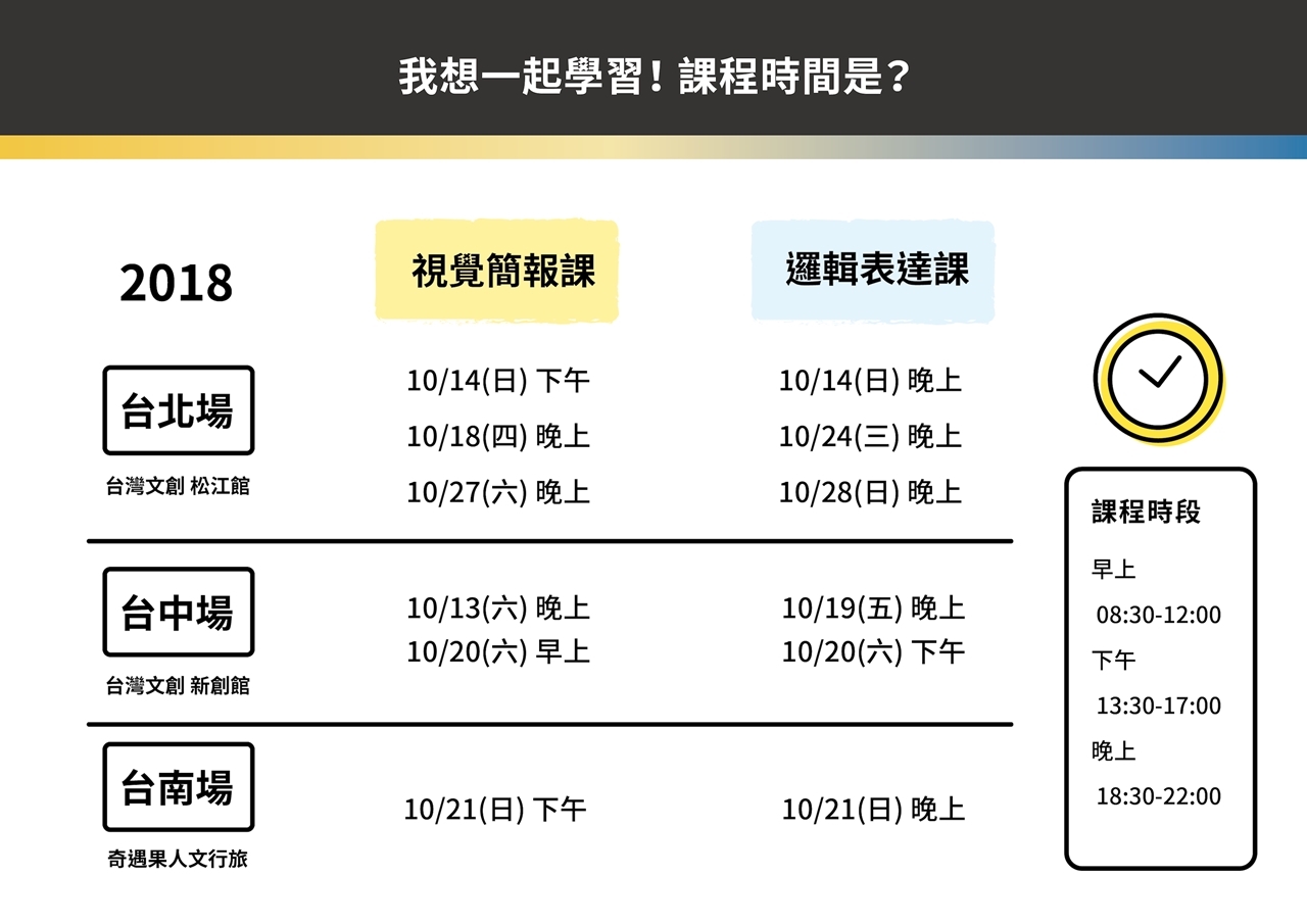 這門升級的課程,把上台必備的簡報力分為 #簡報視覺課 與 #邏輯表達課, 每堂課3.5小時,7小時帶你全盤掌握視覺與表達兩大面向的訣竅。