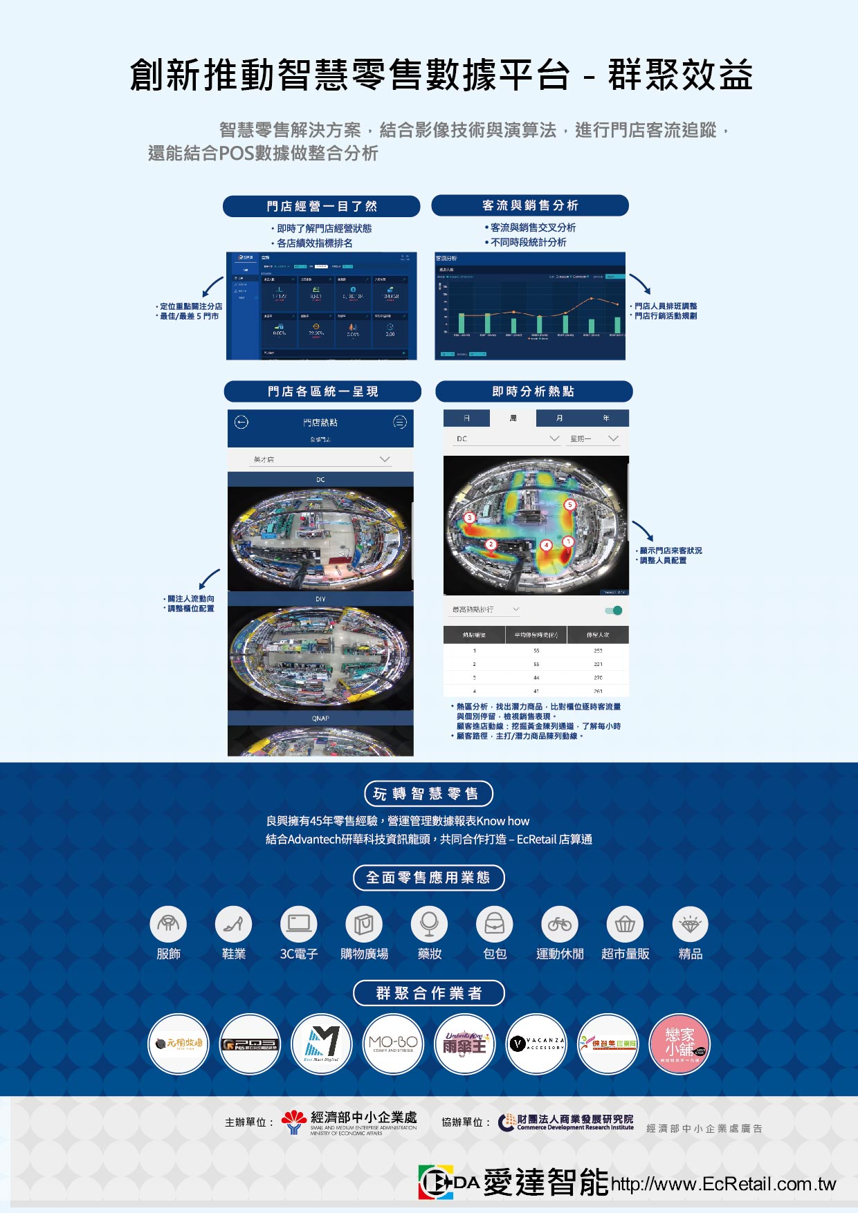 您還在為每天店裡該安排多少人力而苦惱嗎?店內的營業額還再用傳統的POS點發票的方式來評估行銷效益嗎?透過「智慧零售數據服務平台」可以讓經營者擁有更好的科技工具掌握經營管理的know-how!財團法人商業發展研究院,承接經濟部中小企業處的創新推動計畫,透過相關的輔導機制,利用人流數據技術,串聯四大不同門店零售產業,發展智慧零售服務平台,藉由簡單的資通訊的應用服務與案例分享,讓您知道如何輕鬆提升零售門市經營與管理上的成本效益,身為老闆的您,還在為了如何提升門市業績的您,千萬不要錯過這個寶貴的機會!!