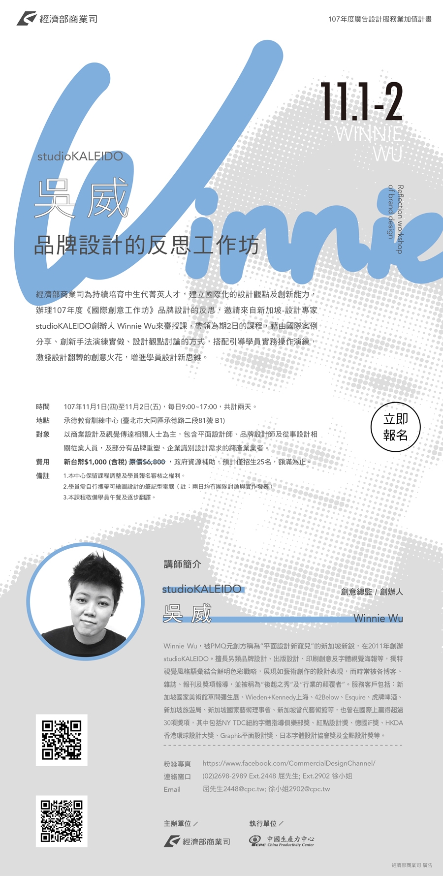 由經濟部商業司主辦,107年度廣告設計服務業加值計畫-第二場國際創意工作坊,邀請來自新加坡studioKALEIDO設計專家Winnie Wu 創意總監擔任講師,擅長另類品牌設計、出版設計、印刷創意及字體視覺海報等,獨特視覺風格語彙結合鮮明色彩戰略,展現如藝術創作的設計表現,兩天的實戰工作坊,以化繁回簡的設計新法,重新思考及注入品牌設計的創意影響力~名額有限!歡迎大家參加!,