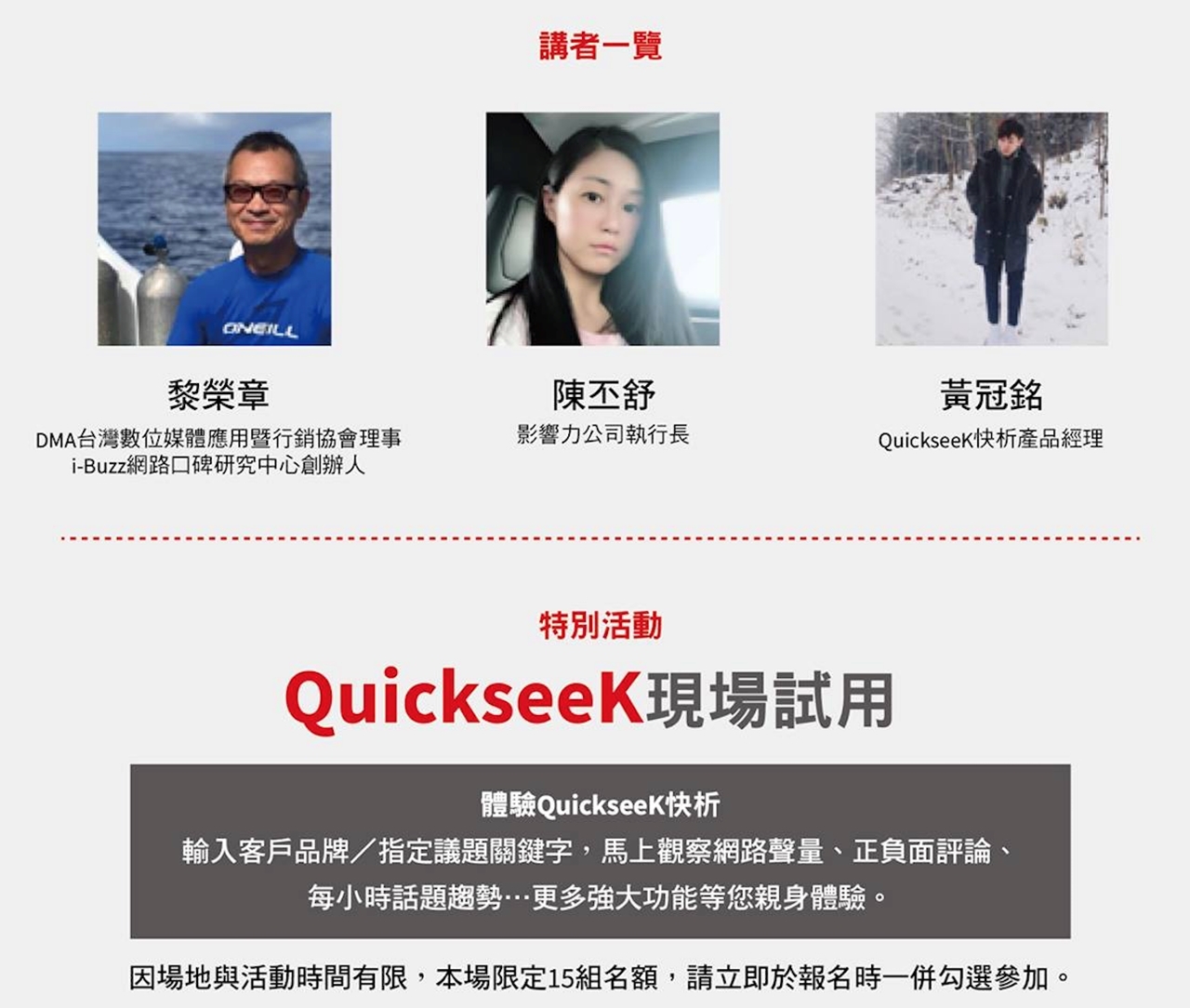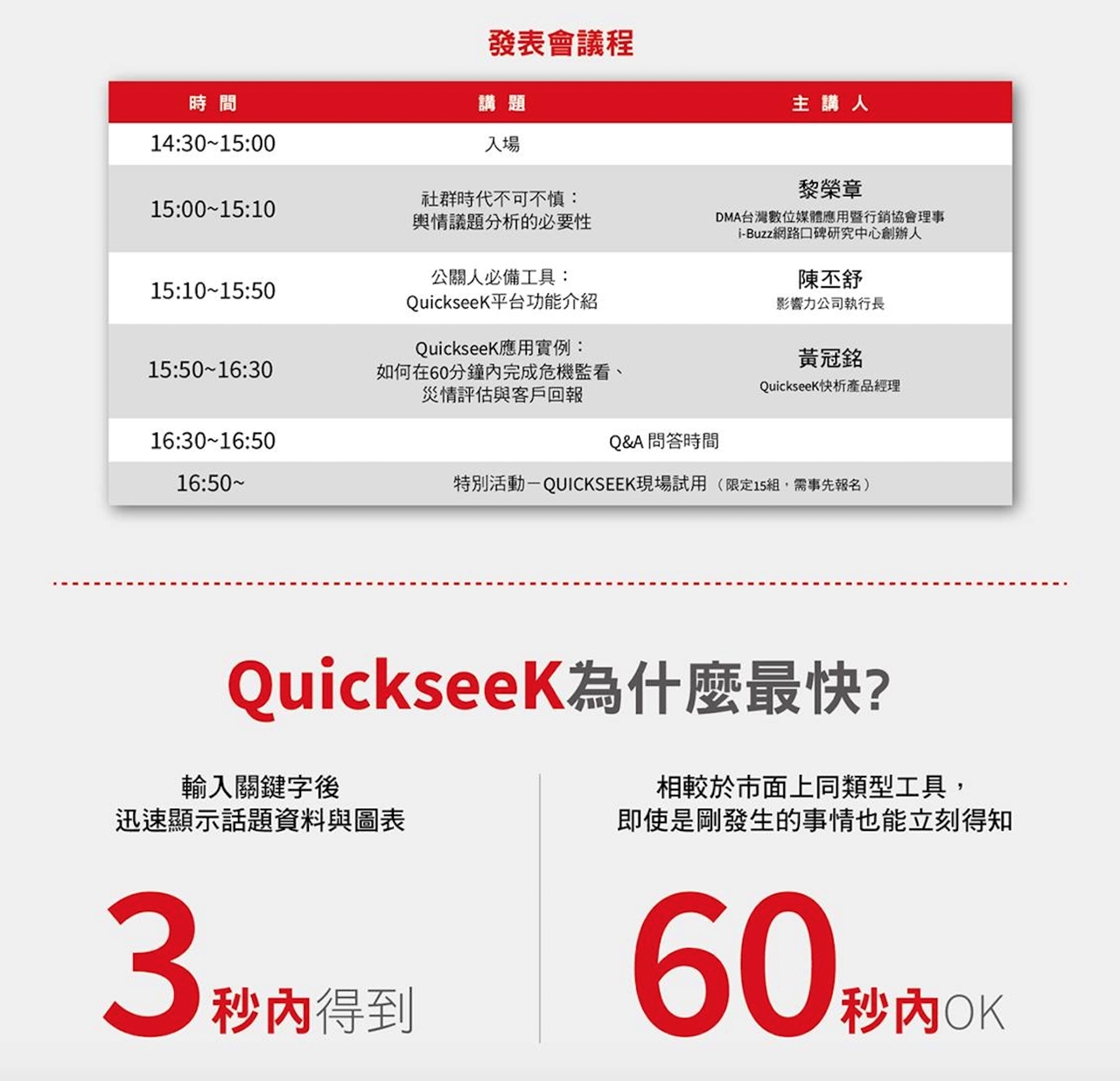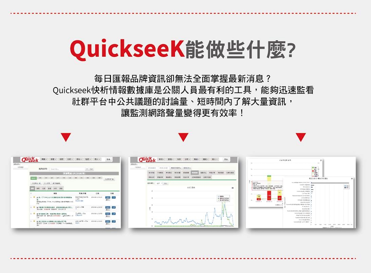 需要迅速搜集網路上各種來源的輿情數據,卻又擔心內容不夠完整? QuickseeK 快析情報數據庫 協助公關人員監看社群平台,短時間內整理大量資料,迅速全面掌握所有網路討論。擁有QuickseeK 輿情大數據系統,你就可以成為大數據分析師!