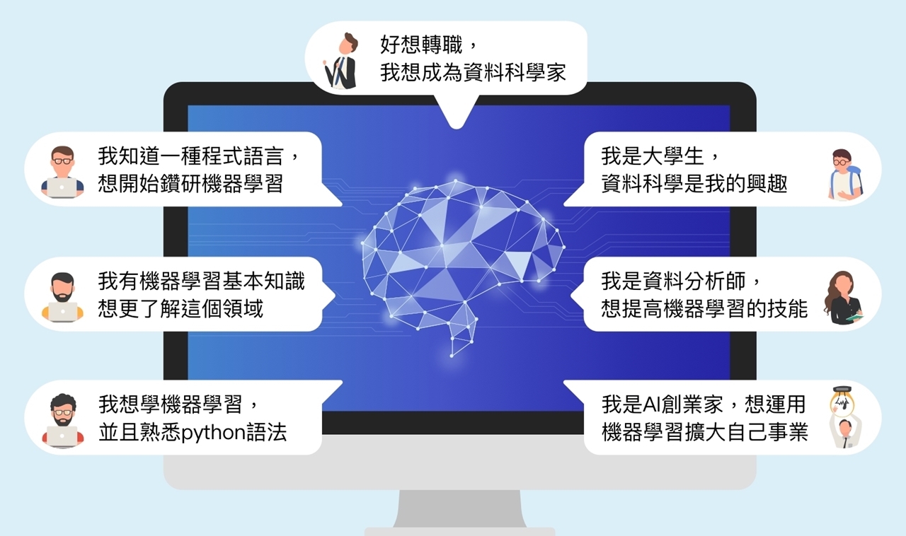 不論你正從事 AI 相關工作,或者想規劃跨界 AI 產業,我們想和你一起分享社群導向的學習方法,希望透過你的參與,一起優化 AI 學習曲線,讓你在資料科學與 AI 領域獲得更多知識與實務經驗分享。