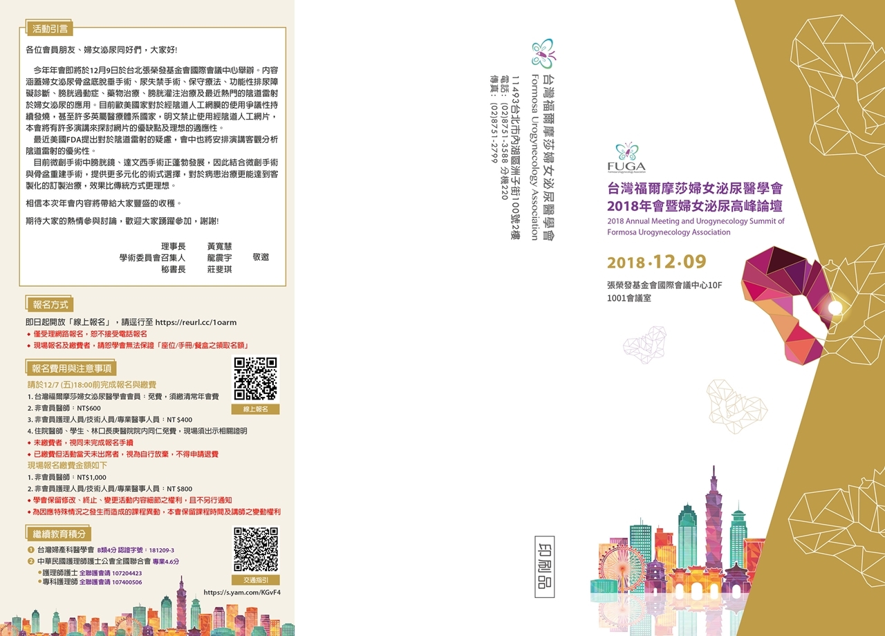 台灣福爾摩莎婦女泌尿醫學會謹訂於2018年12月9日 假 張榮發基金會國際會議中心10F 舉行「2018年會暨婦女泌尿高峰論壇」,本課程已申請各相關單位繼續教育積分,敬邀各位踴躍參加並請協助週知予相關醫護人員報名,謝謝您。
