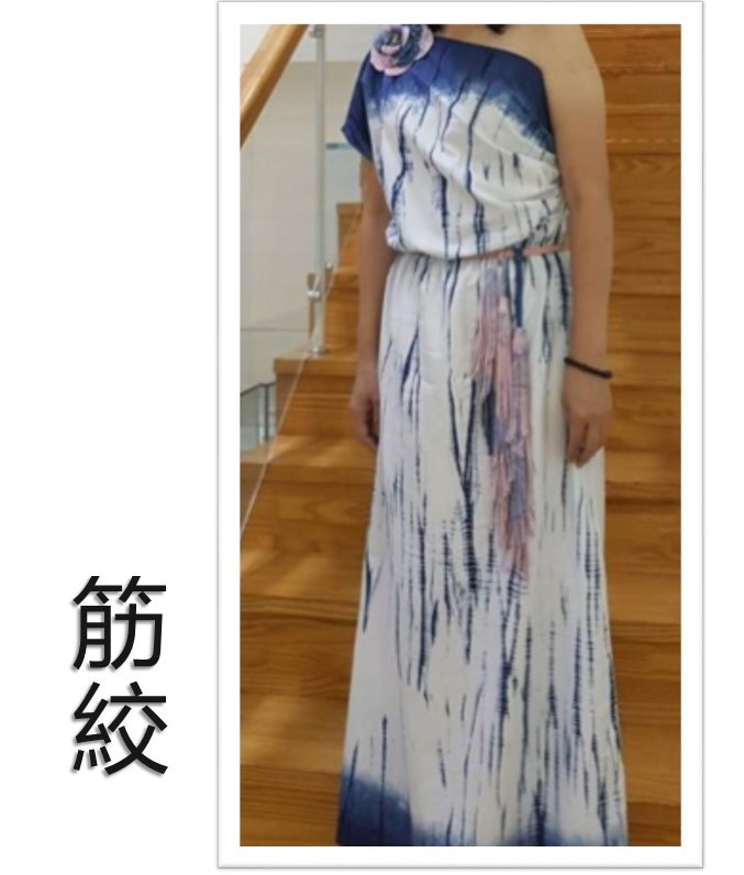 筋絞是日本傳統絞染技法中的一種手作,需要兩雙手相互合作最後完成後的效果如同細長的線條,非常美麗獨特,所以被稱為「筋絞」。