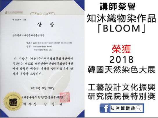 ▍講師介紹知沐老師【韓國「天然染色商品大展」工藝設計文化振興院長獎 得主】