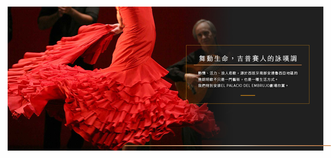 C.舞動生命,吉普賽人的詠嘆調 熱情、活力、浪人悲歌,源於西班牙南部安達魯西亞地區的佛朗明歌不只是一門藝術,也是一種生活 方式。 我們特別安排 EL PALACIO DEL EMBRUJO 劇場欣賞。