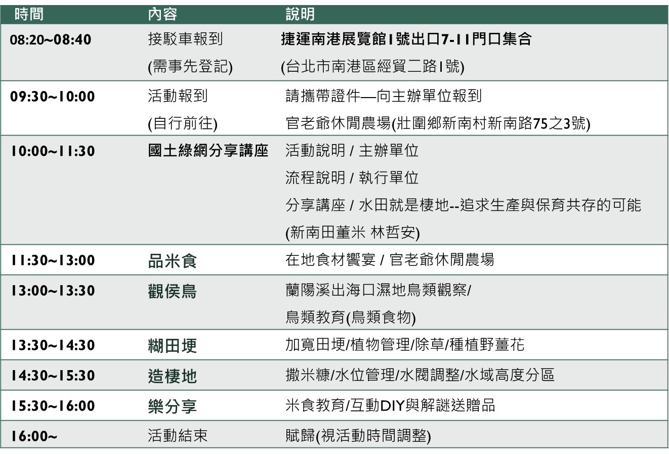 自行前往者,請於9:30至官老爺休閒農場(壯圍鄉新南村新南路75之3號)集合。