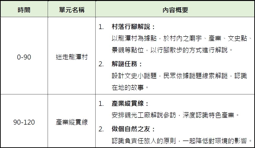 本課程將透過村落解謎尋寶遊戲,引領民眾認識龍潭村的在地故事與產業。是個親近自然、運動散步的好去處。本遊程將由專人解說引導體驗生態之美與認識在地故事。
