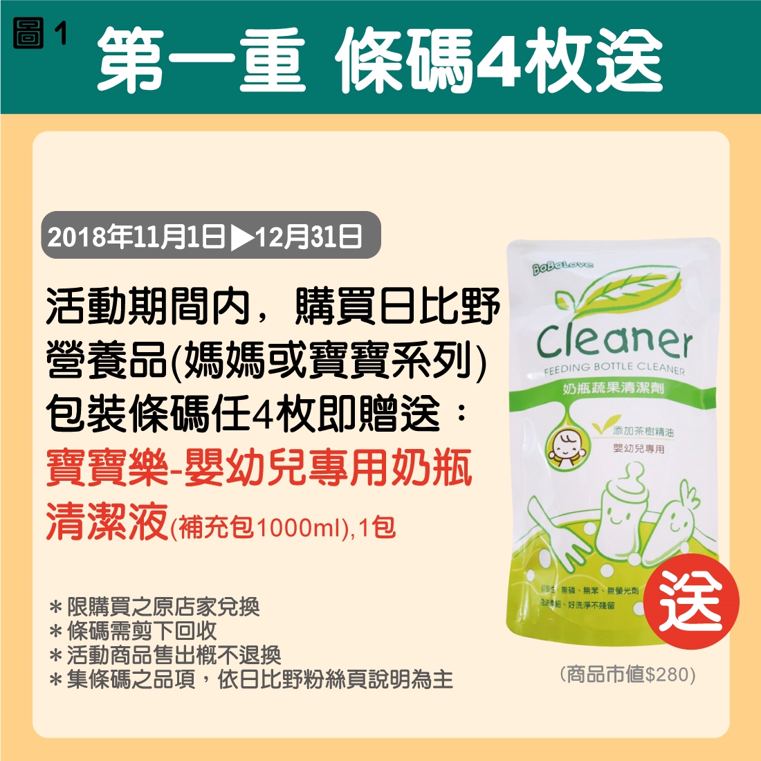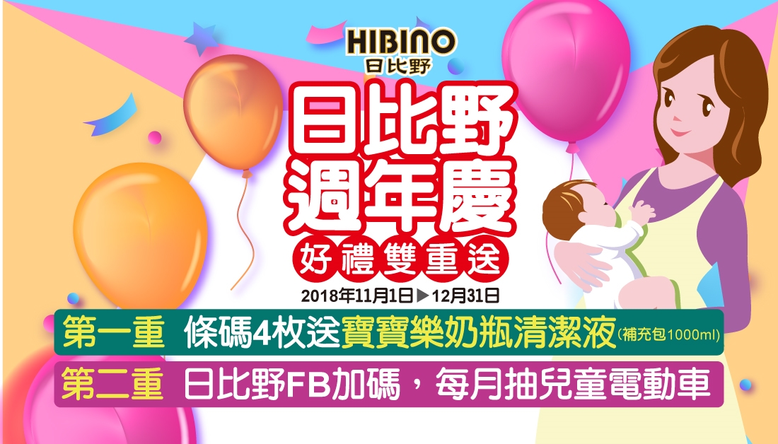 2018年11月1日起~2018年12月31日止!歡慶日比野週年慶!於活動期間內,購買日比野營養品(媽媽系列或寶寶系列),集其包裝條碼任4枚,即贈「寶寶樂-嬰幼兒專用奶瓶清潔液(補充包1000ml),1包」(限購買之原店家兌換)還有機會每月抽大獎,兩次抽獎獎品之總市值達NT$30,000以上!這麼好康,不要錯過!