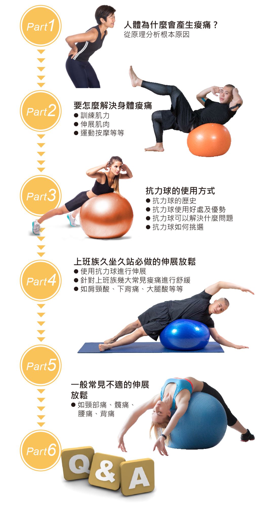 本堂課教你辨識基本的運動傷害與工作職業病痠痛,利用瑜珈球放鬆伸展已經僵硬的肌肉。