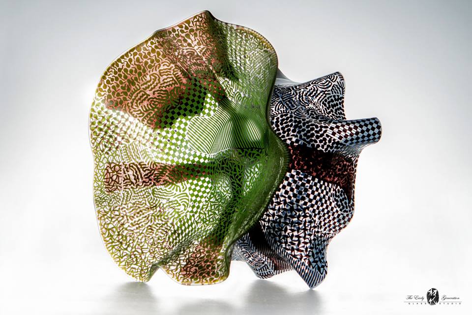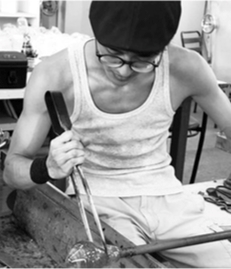 西元1992年出生於台北,從事玻璃吹製創作的他,形容在攝氏1150度的高溫洗禮下,玻璃像流動中的麥芽糖,柔軟卻難以掌握,他聯想到陶藝卻不能直接透過手進行捏塑,只能經由工具的輔助作間接性的觸摸。 享受創作當下的同時,玻璃會在高溫過程中變換各種不同的姿態,必須伴隨著它的轉變從中取得彼此的平衡點,經過反覆高溫形塑,進而使形體演變成心中理想的藝術品。