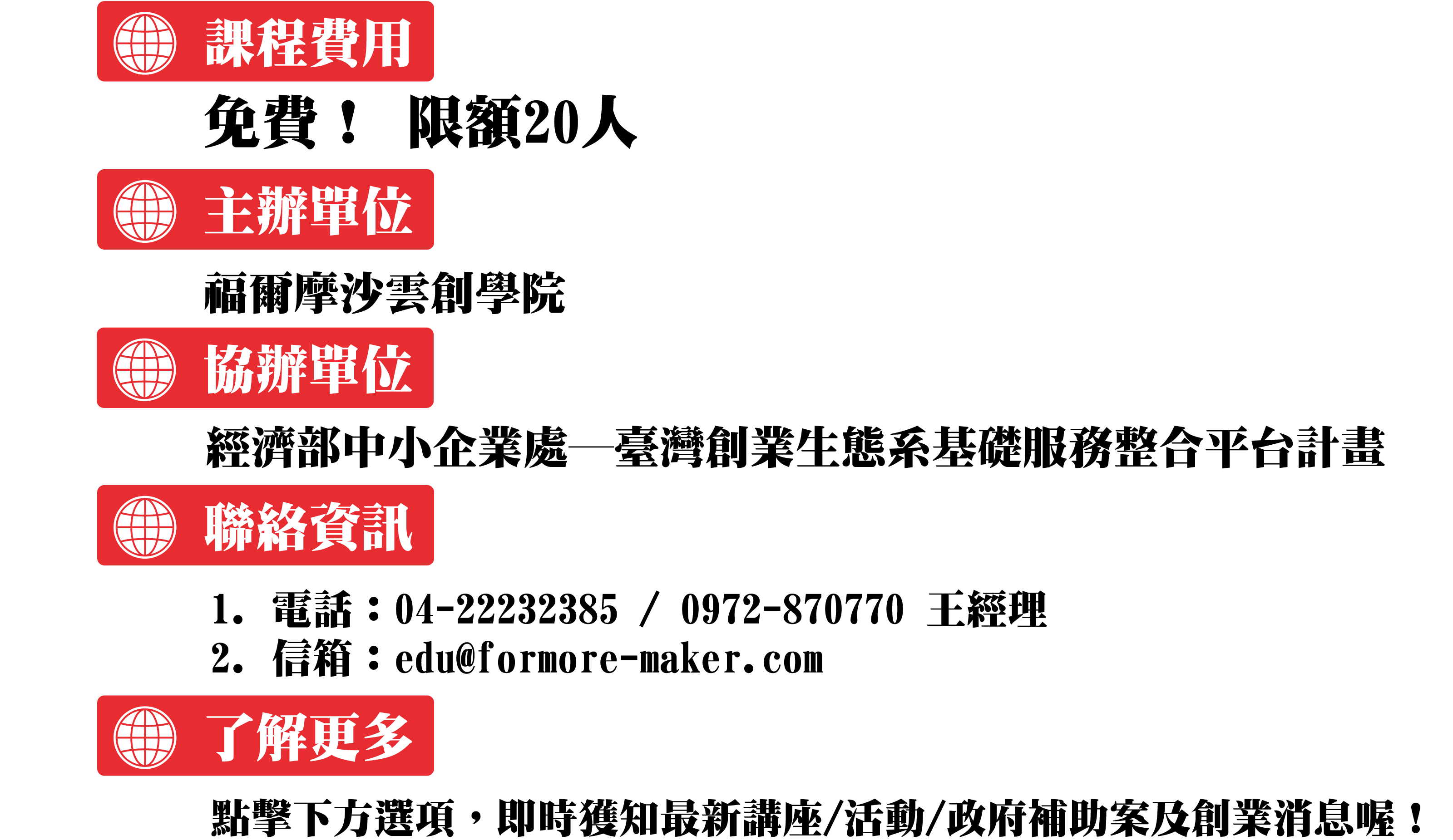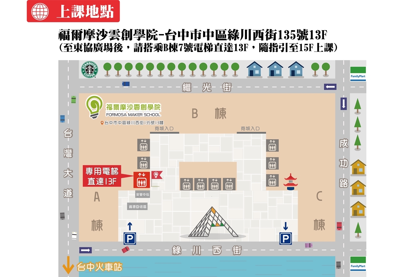 福爾摩沙雲創學院 (至東協廣場後,請搭乘B棟七號電梯直達13F,隨指引至15樓新南向教室上課)