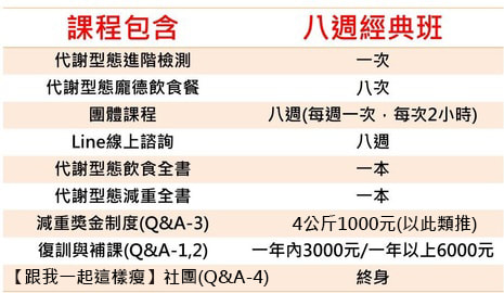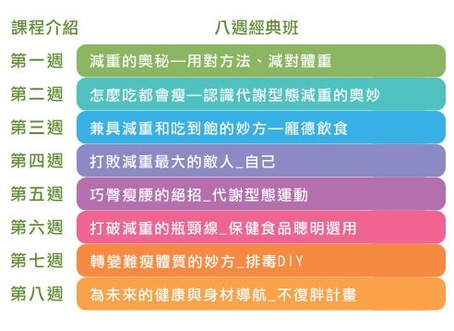 首創以代謝型態檢測技術,並結合營養、心理與運動的全方位體重管理課程,每週一次、每次2小時。課程除了專業知識提供外,更著重於實際演練與體驗。