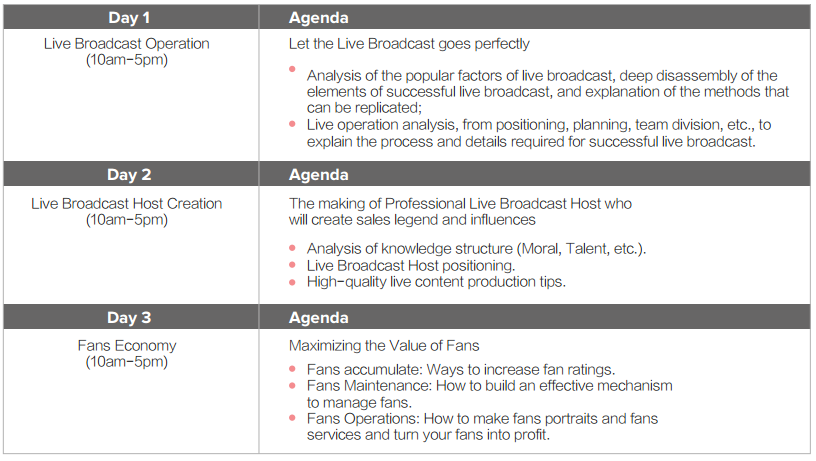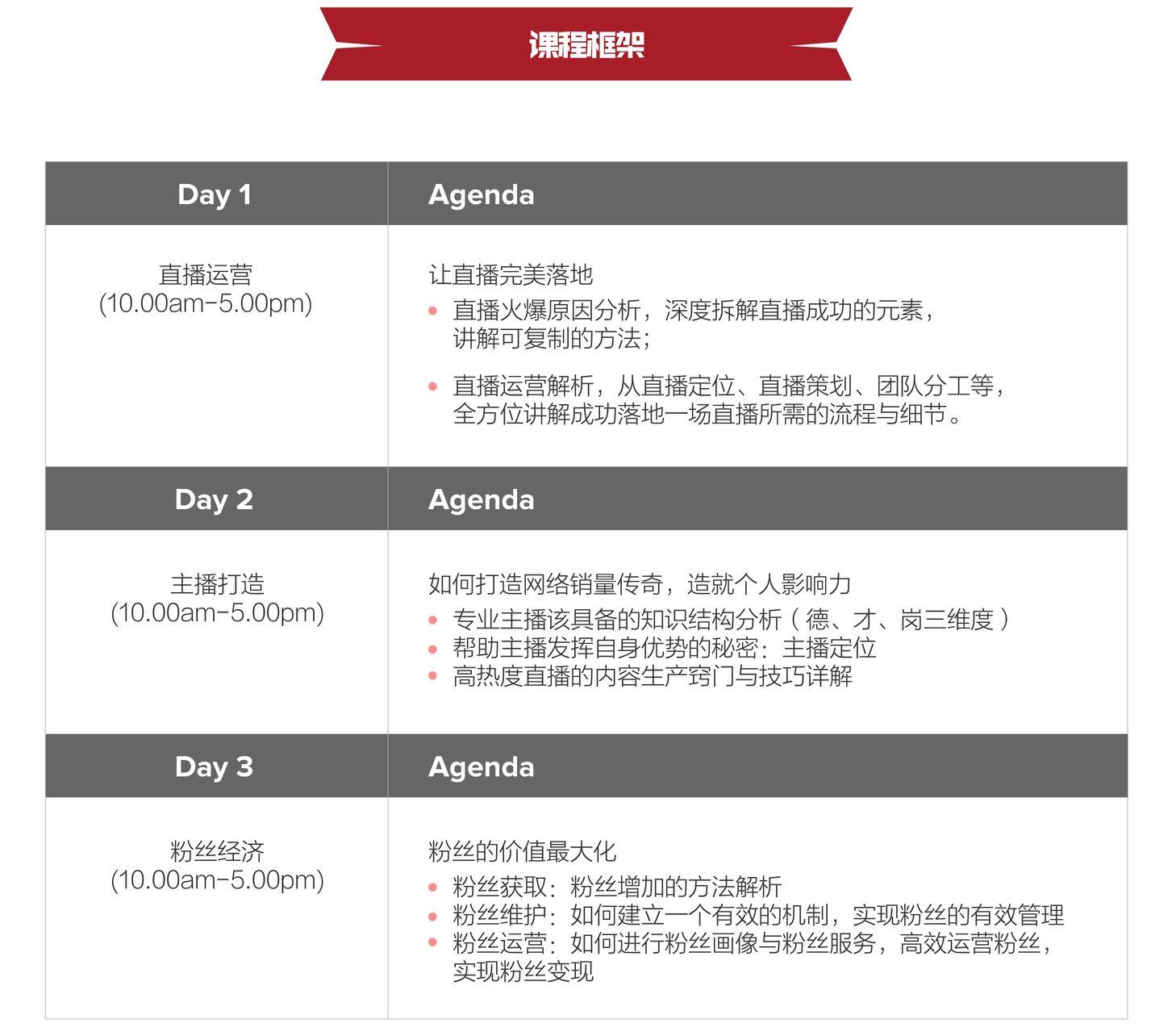 | 对电商来说,时间就是金钱,利用直播提高销售额和流量是我们的最终目的。我们课程透过最短的时间,系统化整理从直播的运营、主播打造和实现粉丝经济的内容,让你吸取立刻可用的内容。这堂课的定位,是希望让一个对直播完全没概念的人,能在三天的时间对于直播框架有个基础但「具备全局的理解」。只需这短短的时间,你将理解如何思考直播的运营,用直播整合公司的行销,提高销售额,更能优化和粉丝的互动,实现粉丝变现。 |